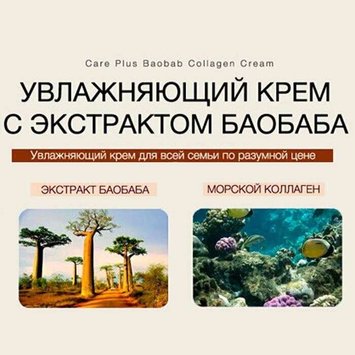 Антивозрастной восстанавливающий крем для лица The Saem Care Plus Baobab Collagen Cream с интенсивным увлажняющим, смягчающим и питательным действием. Средство разработано специально для сухой, обезвоженной и увядающей кожи. При регулярном использовании средство быстро устранит чувство стянутости кожи, мелкими морщинки и неоднородный цвет лица.Преимущества и особенности крема:Отличный состав на основе морского коллагена и экстракта баобаба;Широкий спектр действия - крем работает в нескольких направлениях, проникает в глубокие слои кожи, действуя изнутри;Продукт универсален, его можно использовать не только на коже лица, но и на других участках тела (локтях, коленках, пяточках);Объем в 100 мл и небольшой расход обеспечивают экономичное использование;Крем имеет легкую, приятную текстуру и ненавязчивый аромат.Главные компоненты крема:Морской коллаген прекрасно усваивается нашей кожей, повышая ее прочность, эластичность и стимулируя регенерацию тканей. В результате кожа разглаживается, подтягивается и восстанавливается.Экстракт баобаба оказывает интенсивное увлажняющее действие, устраняет отечность кожи, борется с ее излишней сухостью и ощущением стянутости кожи. Также экстракт баобаба минимизирует разрушительное воздействие свободных радикалов, тем самым продлевая молодость кожи.Крем с коллагеном станет Вашим помощником в борьбе за молодость и красоту кожи. Он легко распределяется по коже, быстро впитывается, не оставляя жирного блеска и ощущения липкости. Кожа чувствует себя максимально комфортно, выглядит свежей и отдохнувшей.Использование: нанесите средство на кожу лица и равномерно распределите легкими массажными движениями.Объем: 100 мл.