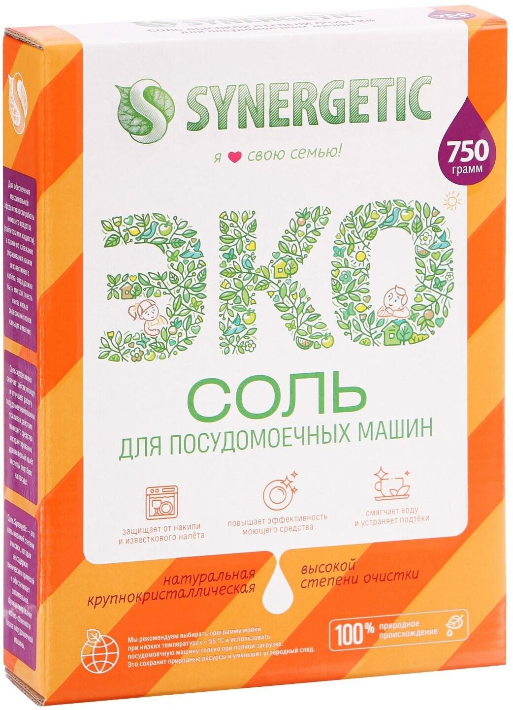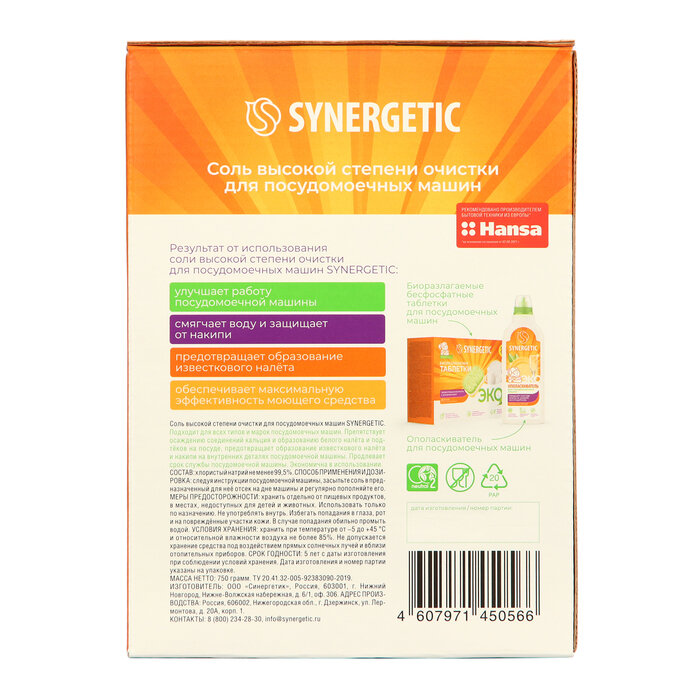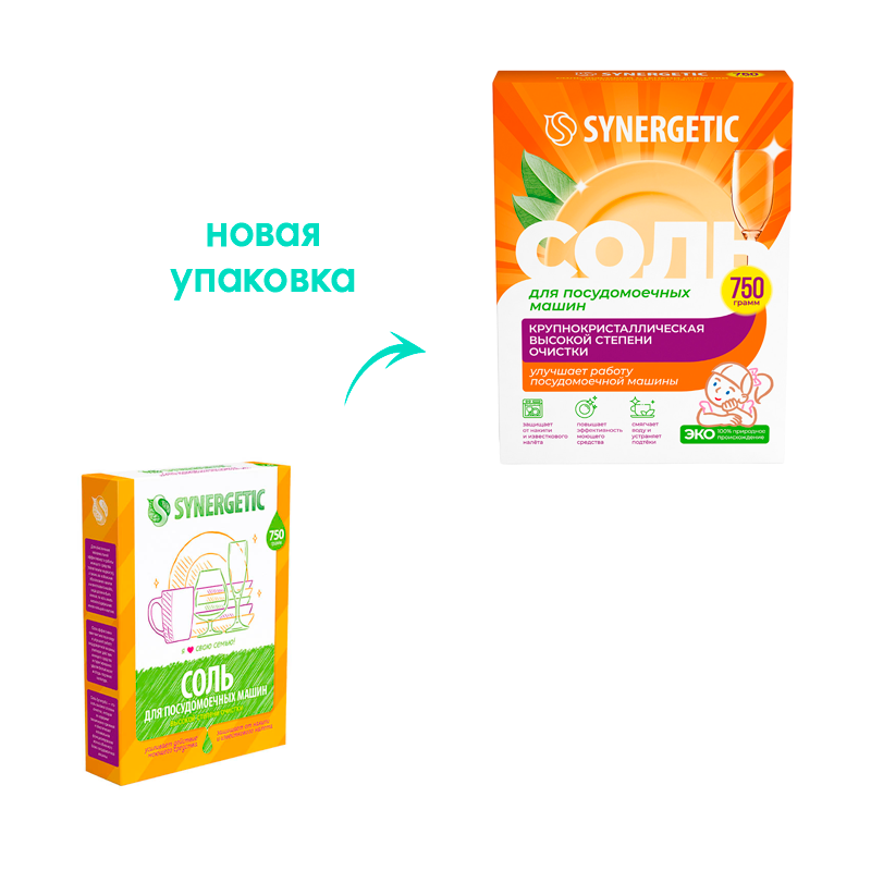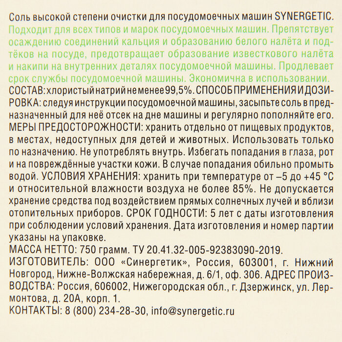 Соль для посудомоечных машин Synergetic высокой степени очистки 750 г 4607971450566