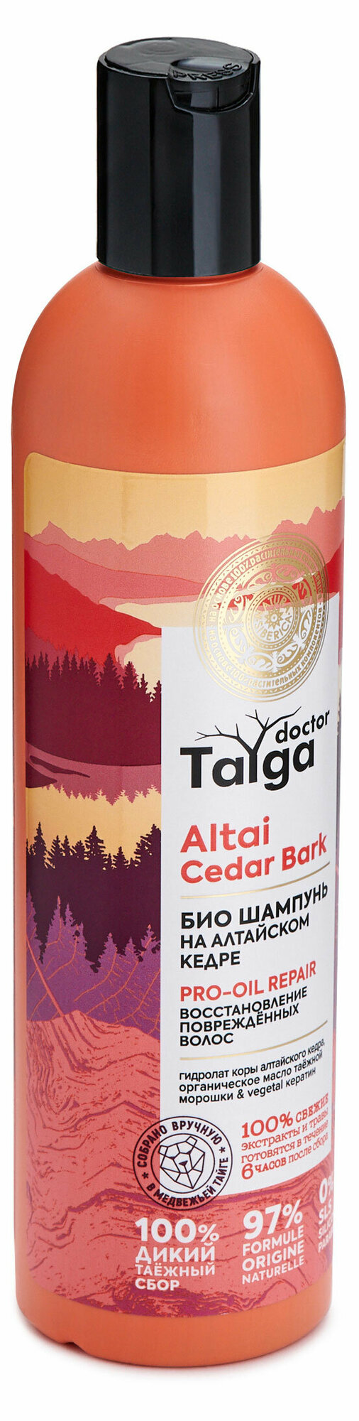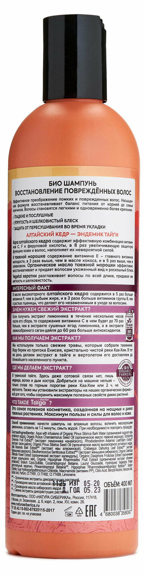 | Состав | aqua with infusions of organic pinus sibirica bark water (органический гидролат коры алтайского кедра), organic rubus chamaemorus seed oil (органическое масло таежной морошки), schizandra chinensis fruit extractfe (экстракт лимонника нанайского), organic pinus sibirica seed oil (органическое масло высокогорного алтайского кедра), rhododendron adamsii leaf/stem extractfe (экстракт саган-дайля), salix alaxensis bark extractwh (экстракт ивы аляскинской), crataegus dahurica leaf extractwh (экстракт боярышника даурского), eleutherococcus senticosus extractwh (экстракт женьшеня сибирского), organic calendula officinalis flower extract (органический экстракт календулы), organic dasiphora fruticosa extract (органический экстракт курильского чая), organic hippophae rhamnoides fruit extract (органический экстракт облепихи алтайской); sodium coco-sulfate, cocamidopropyl betaine, lauryl glucoside, hydrolyzed vegetable protein (растительный кератин), pineamidopropyl betaineps, hippophae rhamnoidesamidopropyl betainehr, sodium chloride, guar hydroxypropyltrimonium chloride, niacinamide (витамин pp), citric acid, benzyl alcohol, benzoic acid, sorbic acid, parfum, ci 77491, ci 77492, ci 77499, limonene., (wh)- органические экстракты дикорастущих растений, (fe) – свежие экстракты дикорастущих растений, (hr) - производное масла алтайской облепихи, (ps)- производное масла сибирского кедра |
