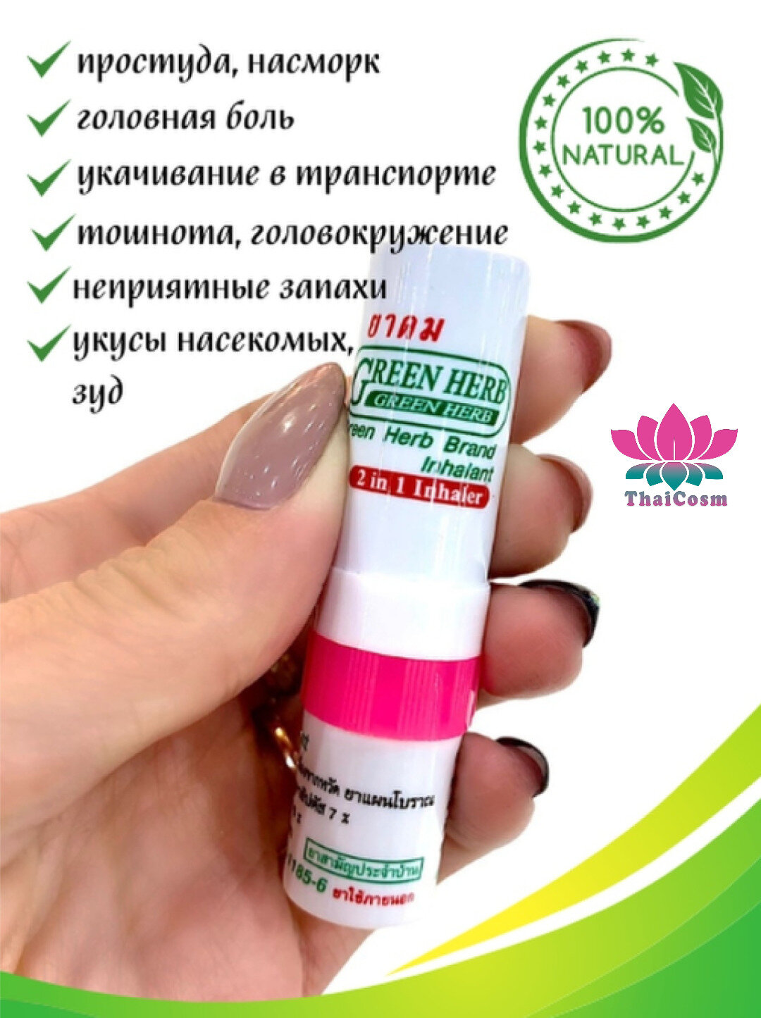 Тайский карманный карандаш-ингалятор Green Herb с эфирными маслами - универсальное и абсолютно натуральное средство на все случаи жизни: отлично помогает при насморке, заложенном носе, эффективен при головной боли, головокружении, тошноте, помогает побороть дискомфорт от неприятных запахов на улице, в общественном транспорте, или когда кто-то рядом курит. Используется для профилактики в период инфекционных заболеваний. Сбалансированный комплекс эфирных масел активирует работу головного мозга, быстро приводит в чувства при слабости и обмороке, тепловом ударе. Эвкалиптовое масло, обладая антисептическим действием, помогает при астме, бронхите, синусите. Ментоловое масло уберёт заложенность носа. Камфоровое масло эффективно борется с простудой, пневмонией, так как облегчает дыхание, а также помогает при морской болезни, при перелётах. Ингалятор состоит из двух частей: в нижней части карандаша находится контейнер с эфирными маслами, а в верхней стержень, пропитанным маслами.