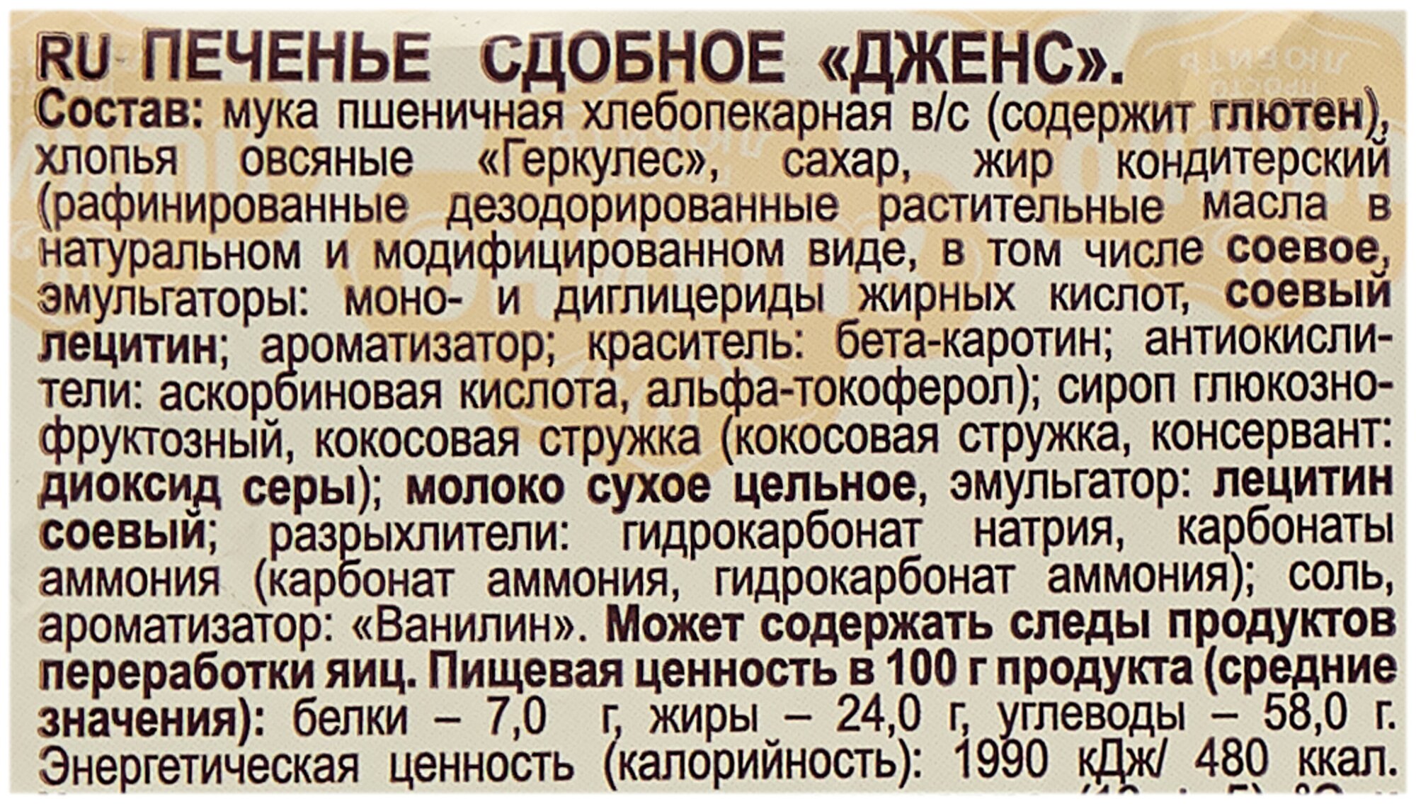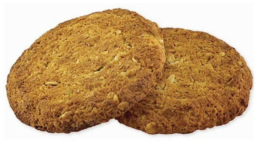 | Состав | мука пшеничная хлебопекарная высшего сорта, сахар-песок, хлопья овсяные "геркулес", маргарин (рафинированные дезодорированные растительные масла в натуральном и модифицированном виде (подсолнечное масло, пальмовое масло), вода, эмульгаторы |