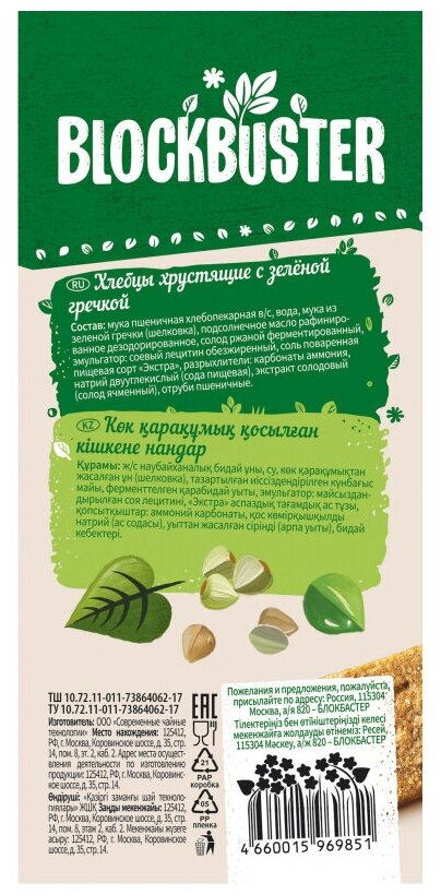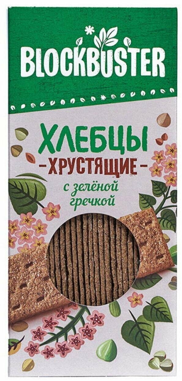 Зерновые хлебцы хрустящие с зеленой гречкой. Готовятся из смеси пшеничной и муки зелёной гречки. Хлебцы содержат клетчатку, которая улучшает пищеварение, очищает организм, Омега3 кислоты. Прекрасная альтернатива хлебобулочным изделиям. Можно употреблять как в качестве перекуса, так и вместо хлеба используя к первым и вторым блюдам. Прекрасно сочетаются с авокадо, сыром, ветчиной, салатами. Хлебцы BLOCKBUSTER подходят людям, придерживающимся вегетарианского питания. В составе используются только натуральные ингредиенты.