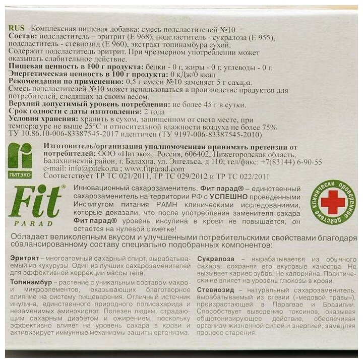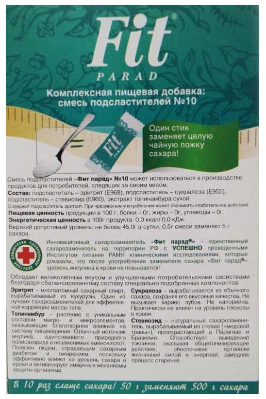 Смеси заменителей сахара FitParad успешно прошли клинические испытания в ФГБУН "ФИЦ питания и биотехнологии" в 2021 г, научно доказано, что смеси на основе эритрита не поднимают уровень глюкозы в крови, оставляя ее на прежней отметке.