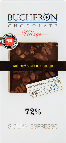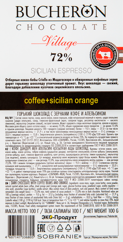 | Состав | какао тертое, сахар, масло какао, какао-порошок, кофе натуральный жареный в зернах, цедра апельсина сушеная (цедра апельсина, сахар, глюкозно-фруктозный сироп, сахарная пудра, регулятор кислотности - лимонная кислота), эмульгатор (лецитин соевый), ароматизатор "ванилин"; общее содержание сухого остатка какао в шоколадной массе - не менее 72%. |