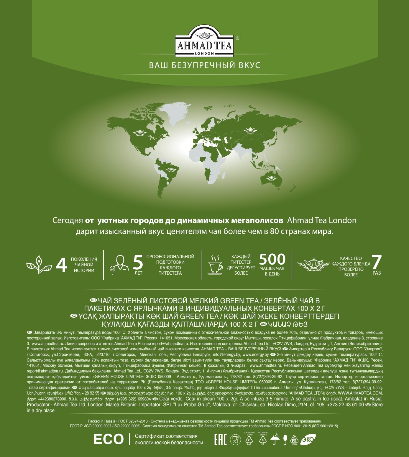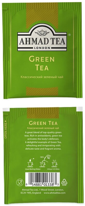 Едва заметная горчинка, свежесть, прозрачность оттенков, воздушность, легкость и чистота. Чай, способный, как и тысячу лет назад, прояснить сознание, успокоить поток эмоций, подарить сосредоточенность и гармонию. Чай со вкусом философской беседы, помогающий концентрации мысли и создающий дружественную атмосферу. В пакетиках Ahmad Tea используется только листовой измельченный чай высшего качества. Истинный ценитель чая знает, что в основе разнообразия вкусов от Ahmad Tea всегда лежит безупречное качество чая.