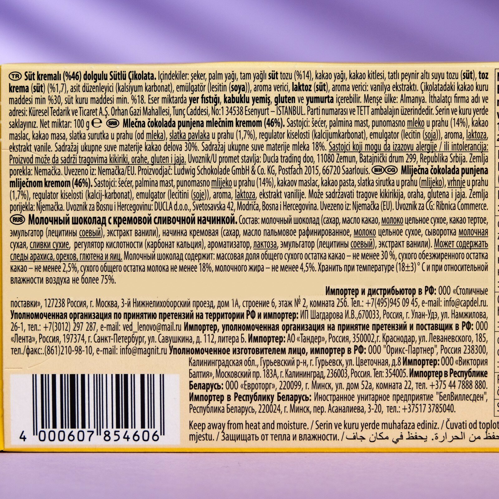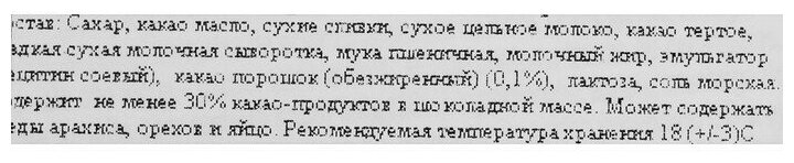 | Состав | сахар, какао масло, пальмовое масло, сухие сливки, сухое цельное молоко, какао тертое, сладкая сухая молочная сыворотка, стабилизатор (карбонат кальция), молочный жир, эмульгатор (соевый лецитин), лактоза, экстракт ванили. содержит не менее 30,0% какао - продуктов в шоколадной массе. |