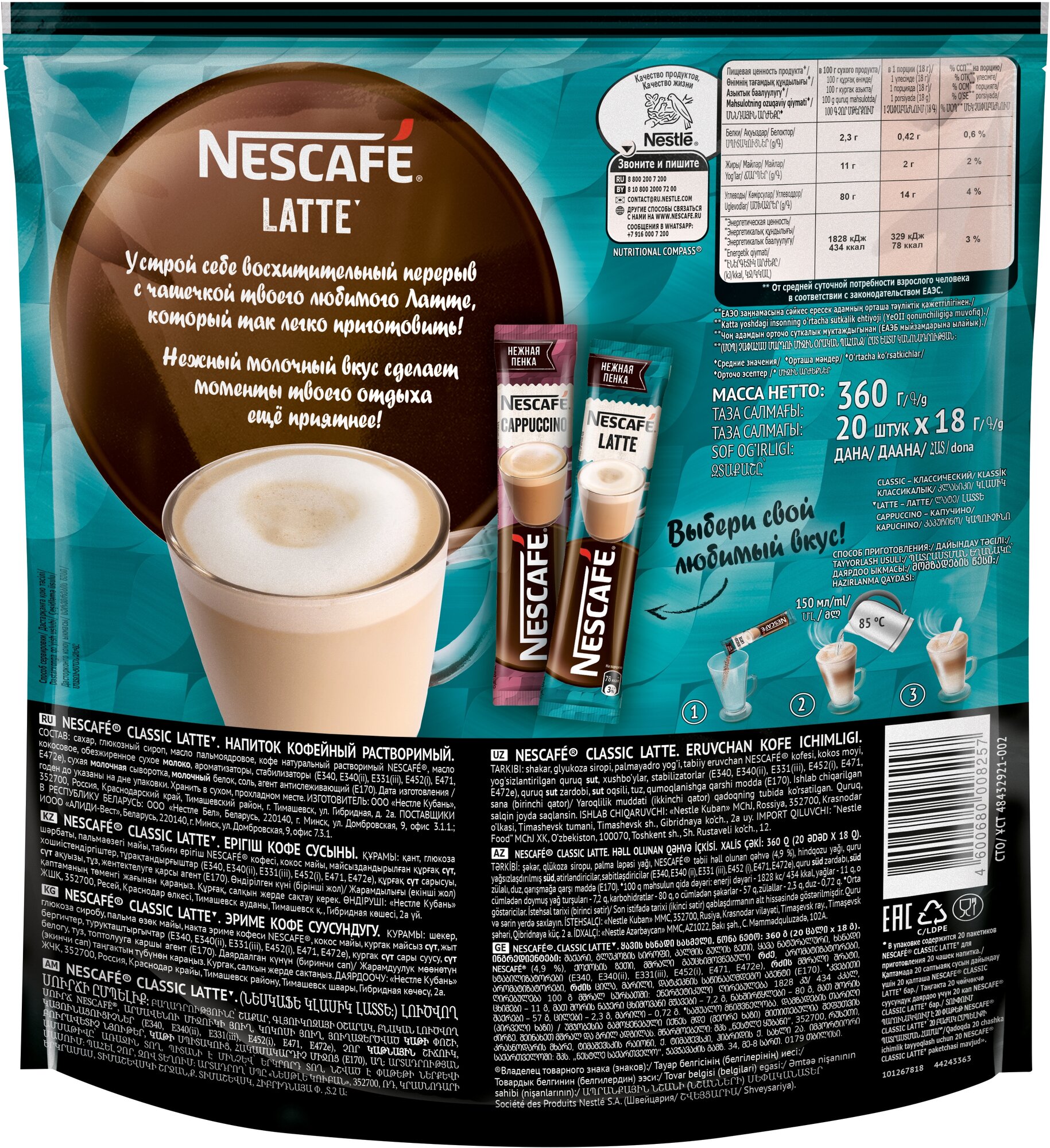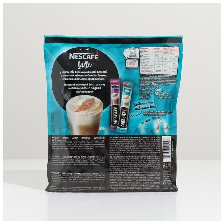 NESCAFE Latte это новый формат классического молочно-кофейного напитка в удобной упаковке. Его можно приготовить буквально за несколько секунд и сразу наслаждаться нежным вкусом. Для этого вам понадобится пакетик NESCAFE, 200 мл горячей воды и любимая кружка! Как зарядиться энергией и поднять себе настроение даже в самую дождливую погоду? Конечно, заварить себе NESCAFE Latte. Это классический кофе для вашего идеального перерыва в любое время дня. Куда бы вы ни отправились в офис, на учебу, в путешествие или на встречу с родными, он всегда будет кстати. Удобный формат NESCAFE в маленьких пакетиках 18 грамм позволяет взять его с собой, куда угодно. NESCAFE Latte сделан из качественных кофейных зерен, выращенных по специальной технологии. В растворимый кофе сразу добавлены сахар и молоко, поэтому теперь, чтобы выпить кофе, не нужно долго ждать. Высыпьте содержимое фольгированной упаковки в чашку, залейте горячей водой, перемешайте, а затем через 20 секунд перемешайте еще раз. Наслаждайтесь любимым напитком с мягким молочным вкусом и соблазнительным ароматом.