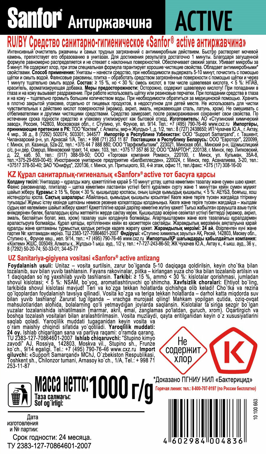 Средство санитарно-гигиеническое "Sanfor" - интенсивный очиститель ржавчины и самых трудных загрязнений с антимикробным действием. Быстро растворяет водный и мочевой камень, препятствует его образованию в унитазах. Для достижения результата достаточно 1 мин. Благодаря загущенной формуле равномерно распределяется и не стекает с наклонных поверхностей, обеспечивает свежий запах. Убивает микробы за 1 минуту. Не содержит хлор, при этом специальная формула гарантирует хорошие чистящие и дезинфицирующие свойства. Обладает антимикробными свойствами. Способ применения: унитазы, душ, краны - нанести средство, при необходимости выдержать 5-10 мин, почистить с помощью щётки и смыть водой. Фаянсовые раковины, плитка - обработать средством загрязнённые поверхности с помощью щётки и через 1 минуту тщательно смыть водой.