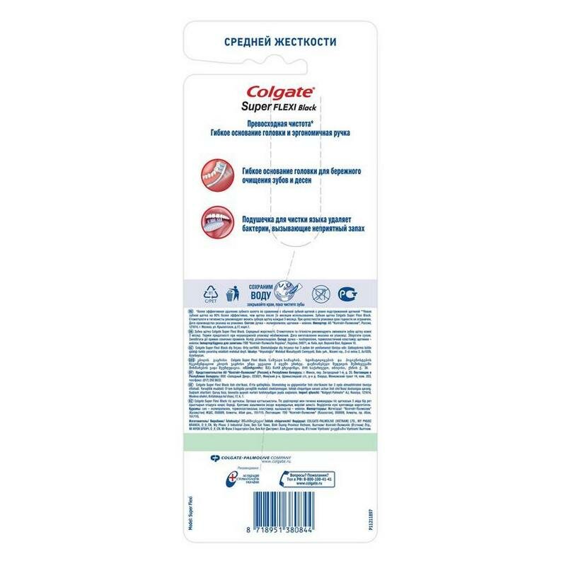 Зубная щетка Colgate Super Flexi Black средней жесткости отличается от остальных щеток своей гибкой головкой, которая оказывает меньше давления на дёсны, при этом сохраняя качество чистки.