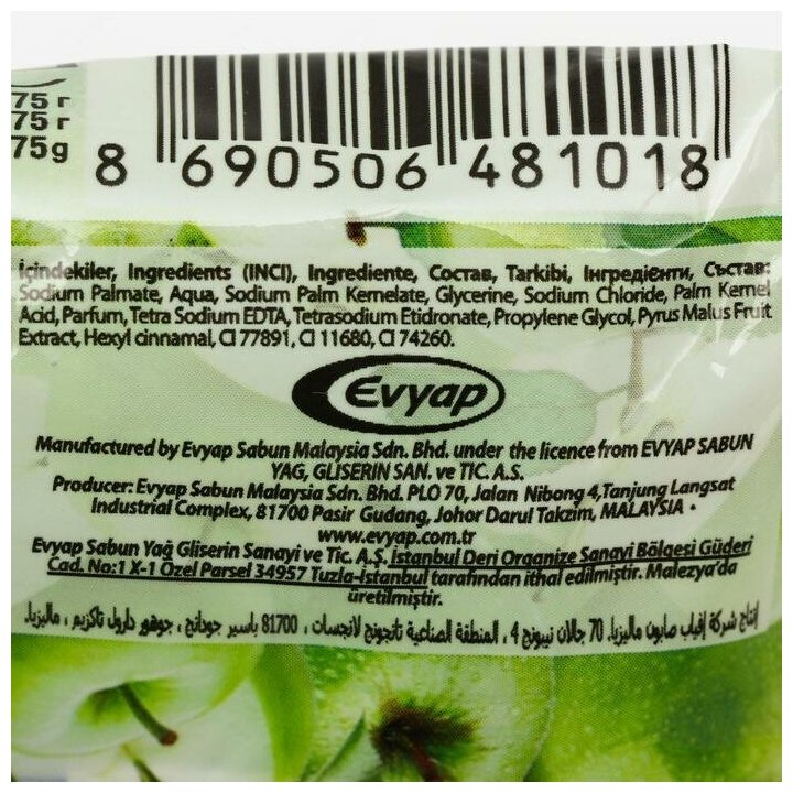 | Химический состав | Палмат натрия, вода, ядра пальмы натрия, карбонат кальция, парфюм, глицерин, хлорид натрия, кислота ядра пальмов, экстракт фруктов pyrus malus, масло persea gratissima, tetrasodium edta, tetrasodium etidronate, hexyl cinnamal, cl 21100, cl 74260. |