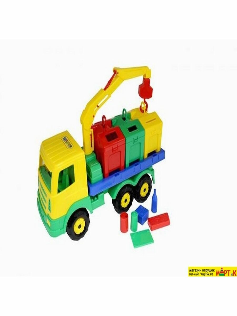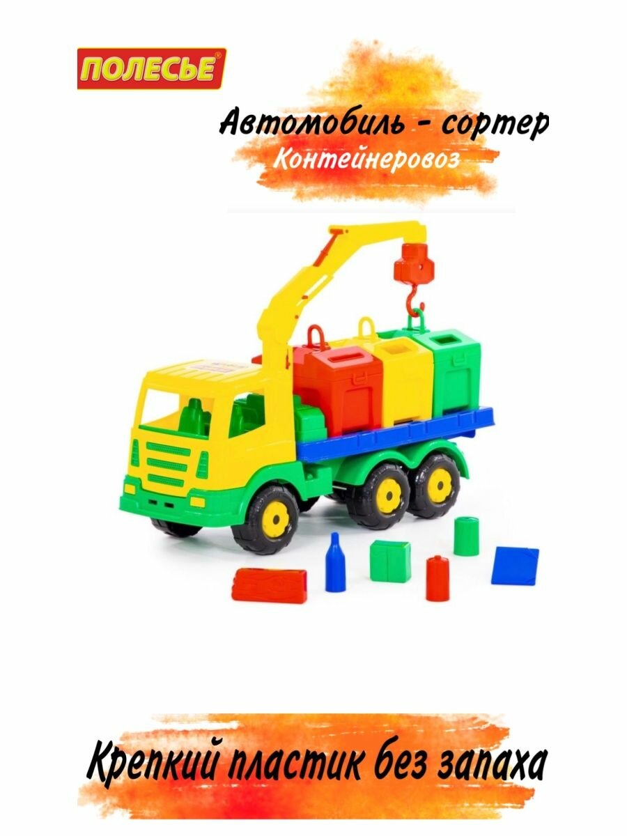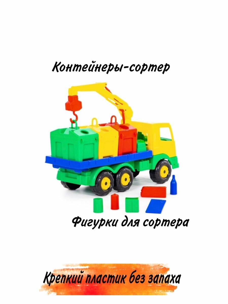 Яркая игрушка, предназначенная для перевозки цветных контейнеров. Ребёнок в игровой форме изучает цвета и развивает моторику рук. Автомобиль станет отличным дополнением автопарка малыша. На машине установлен поворотный манипулятор с крюком. При помощи манипулятора ребёнок сможет загружать и снимать контейнеры с платформы автомобиля. Все контейнеры оборудованы открывающейся крышкой. Игрушка позволяет перевозить различные мелкие грузы. Также автомобиль-контейнеровоз можно использовать как эвакуатор. На игрушке установлена откидывающаяся платформа. Внутри контейнеров имеются пластиковые детали, имитирующие разные виды мусора. Серия автомобилей «Престиж» знакомит детей с различными механизмами, трудовыми процессами, развивают фантазию и пространственное мышление.