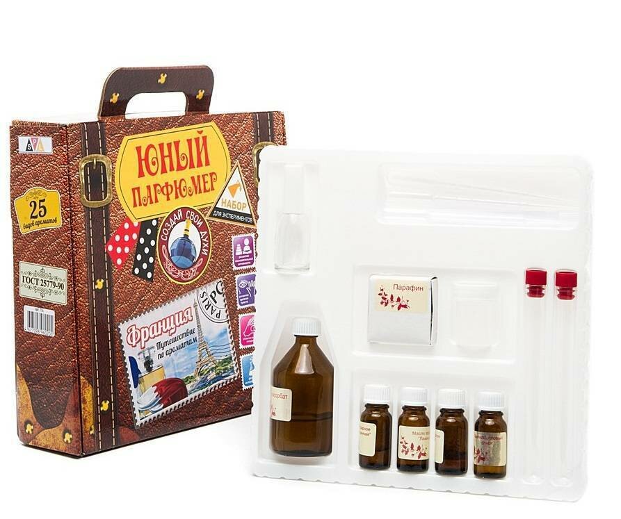 Занятный набор поразит вашего ребенка своей оригинальностью и раскроет все секреты создания парфюмерных ароматов. Благодаря набору, ваш ребенок станет обладателем уникальных знаний. К тому же, не каждый сможет похвастаться опытом в создании французских ароматов.Набор "Юный Парфюмер" "Путешествие по ароматам" "Франция" оформлен в виде чемоданчика для путешествий.В наборе:инструкция,полисорбат,восковые основы для смешивания масел,пластиковая баночка,парфюмерный флакон,блоттеры,эфирные масла.Исключительно натуральные ингредиенты подтверждают высокое качество этого детского набора. Вся продукция бренда "Инновации для детей" выполнена из экологически чистых материалов и безопасна в использовании.Следуя инструкциям внутри, у вас получится изготовить 25 настоящих, неповторимых ароматов. Пробуйте, сравнивайте, изобретайте и не забывайте хвалить ребенка, ведь он создал это сам!Познавательный набор способствует развитию мелкой моторики, органов обоняния, интереса к науке. Увлекательное занятие воспитает в ребенке усидчивость и аккуратность. Чтобы смешать важные ингредиенты в необходимом количестве, придется сосредоточиться и не торопиться.