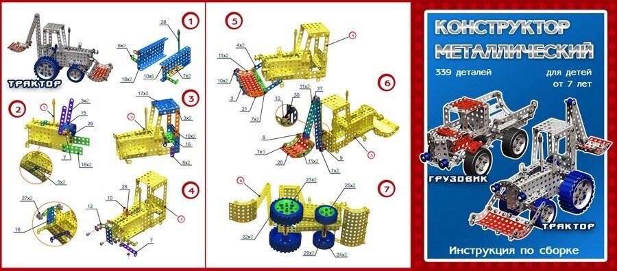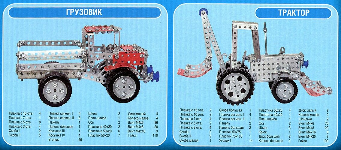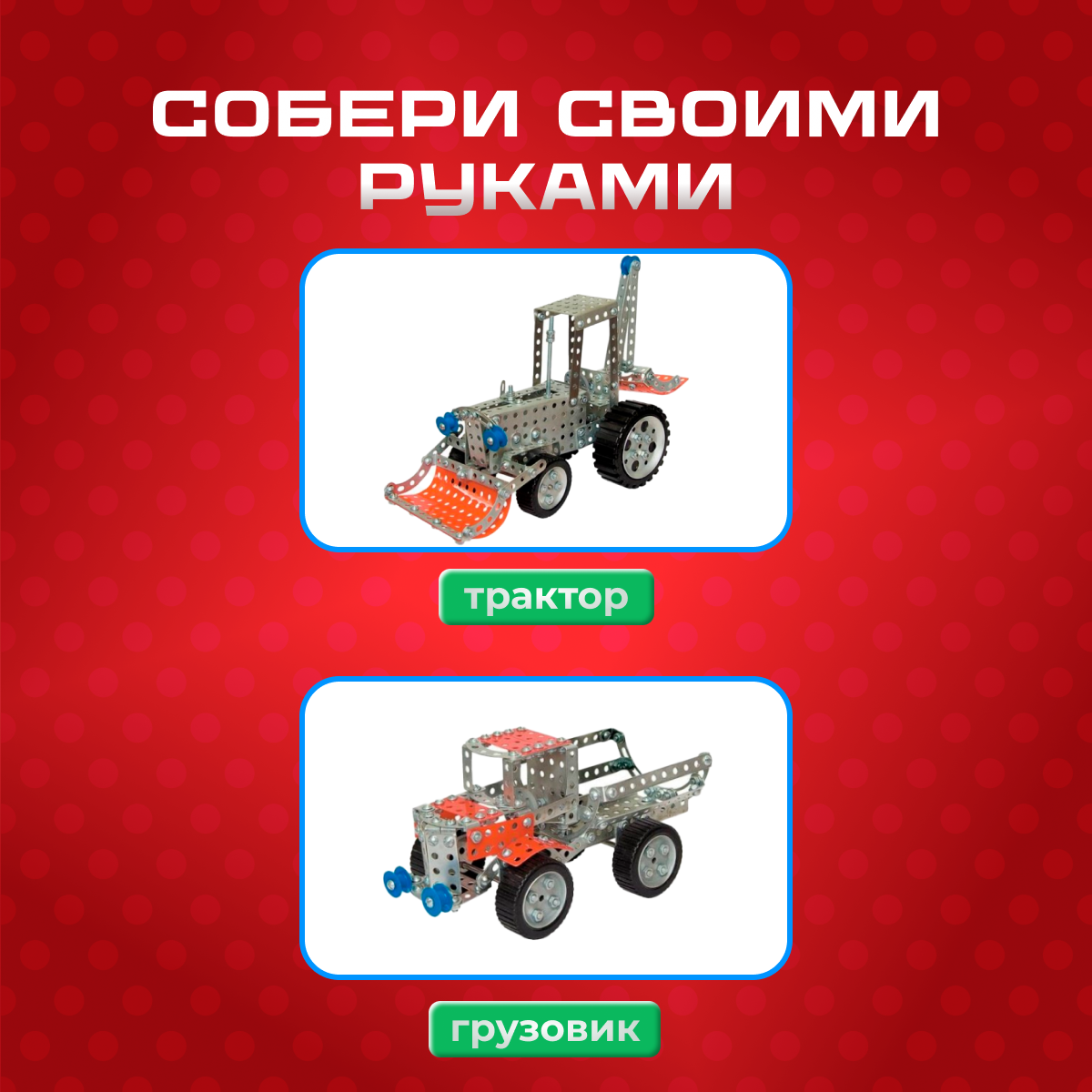 С помощью этого конструктора ребенок сможет собрать превосходную модель грузовика и трактора! Металлический конструктор - находка для ребят, которые любят мастерить для развития инженерных навыков. В набор входят инструменты для сборки - отвертка и гаечный ключ. Собранные транспортные средства - это качественные прочные модели, которые пригодятся для других игр. Конструктор металлический "Грузовик и Трактор" предназначен для детей от 6 лет и старше и состоит из 345 деталей. Комплектность набора позволяет собрать ребенку две модели. Помимо классических деталей из металла, в этот набор входят яркие пластиковые элементы, которые придадут моделям более "веселый" вид. В процессе работы Ваш ребенок научится пользоваться отверткой и ключом, а также инструкцией по сборке. Понаблюдайте за малышом некоторое время, и вы быстро определите степень своего участия в процессе. В зависимости от возраста и уже имеющихся навыков, кого-то можно оставить наедине с конструктором на достаточно длительное время, а кому-то придется регулярно помогать.В комплекте Детали конструктора Отвертка Гаечный ключ Инструкция