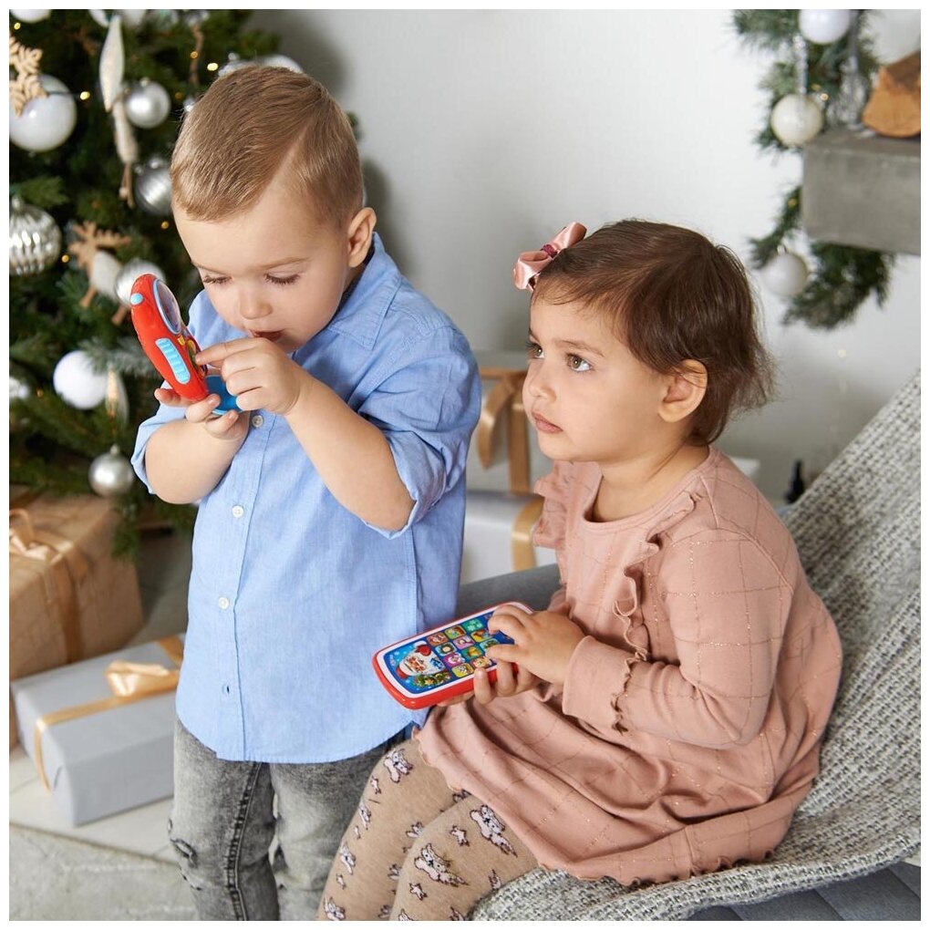 Дед Мороз знает, о чем мечтает ваш ребенок! Теперь у малыша будет свой телефончик - яркий, фигурный, музыкальный, с "экранчиком" и огоньками! Кроха с радостью будет слушать и подпевать любимые новогодние песенки ("В лесу родилась елочка", "Рождественская песенка", "Кабы не было зимы", "Песня Деда Мороза", "Расскажи, Снегурочка", "Белые снежинки", "Зима", музыкальное поздравление от Снегурочки и Деда Мороза "Всех с Новым годом!"), а веселые звуки на нижних кнопках не дадут заскучать. Размер и форма игрушки идеально подходят для маленьких ручек. Телефончик с песнями и звуками стимулирует развитие речи, памяти и внимания ребенка. Дополнительный презент - интерактивная книжка "Караоке с мультиками" для смартфона или планшета в приложении "Азбукварик". QR-код для скачивания - на обратной части упаковки.Источник питания: 3 батарейки типа AG13/LR44 (в комплекте - демонстрационные).Размер игрушки: 6X12,5 см.