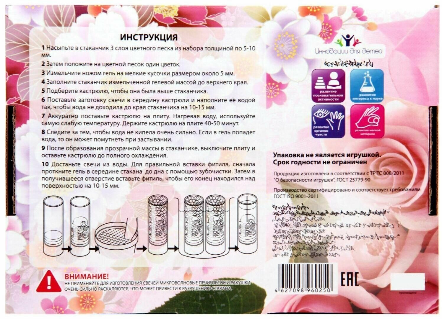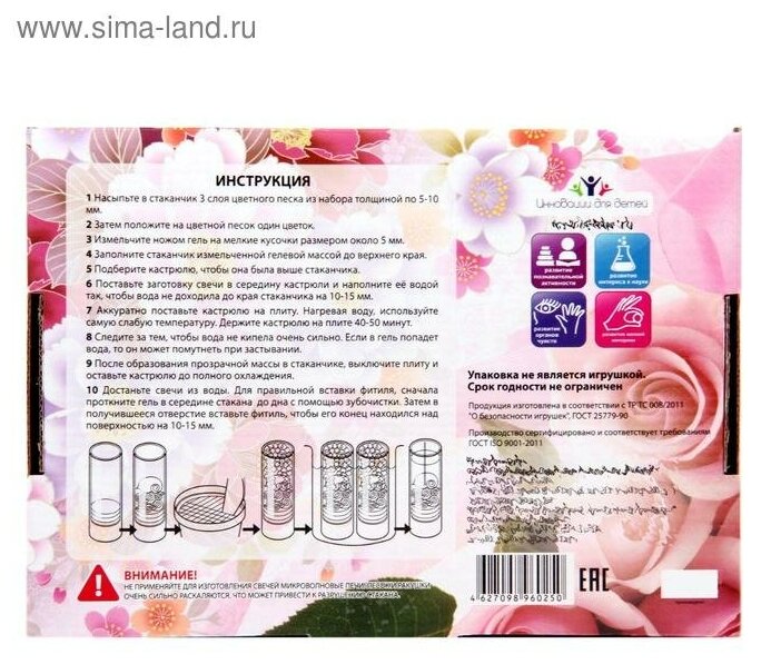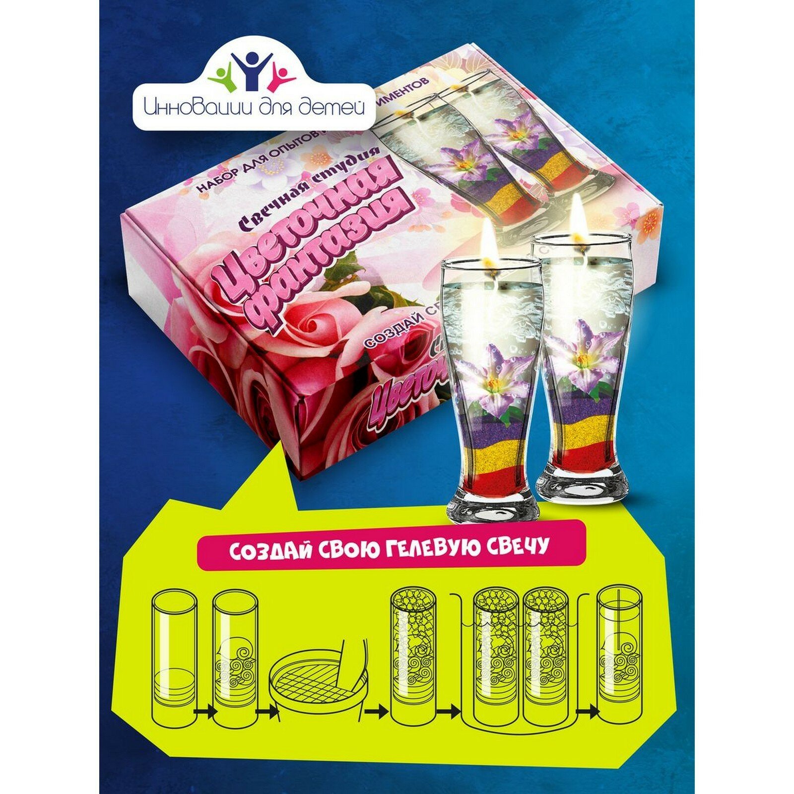 Если ваш ребенок проявляет дизайнерские способности, то помогите ему их развить. Оригинальный набор для создания гелевых свечей заинтересует творческую натуру. Он включает в себя все необходимые ингредиенты для создания невероятно красивых свечей.В наборе "Свечная студия" "Цветочная фантазия":3 вида разноцветного декоративного песка,2 стеклянных стакана,2 фитиля,гель для горения,аксессуары для украшения,пластмассовый нож, ложечка и зубочистка.Вы можете не переживать за безопасность своего ребенка - вся продукция бренда "Инновации для детей" выполнена из экологически чистых, качественных материалов. В том числе и гель для горения - он сварен из натуральных компонентов.Подробная инструкция позволит ребенку самостоятельно пройти каждый этап создания и декорирования свечки. Увлекательный процесс сделает ребенка усидчивым и познакомит с новыми материалами, текстурами и ингредиентами. Красивые искусственные цветки завершат образ - ребенок увидит результативность своего труда.По итогу творческого процесса готовая свеча станет маленькой гордостью. Отлично подойдет в качестве подарка для близкого человека или украсит домашний интерьер. Главное - будет стимулировать кроху к дальнейшим экспериментам и подобного рода увлечениям.