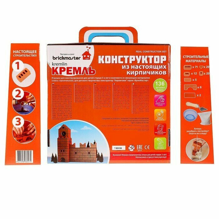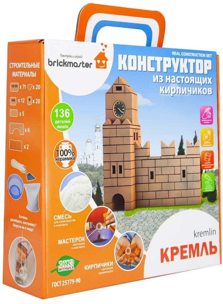 Конструктор Brickmaster позволит ребенку почувствовать себя настоящим архитектором и самостоятельно построить одну из самых известных достопримечательностей Москвы — Кремль с зубчатыми стенами и башней. Конструкторы Brickmaster не похожи ни на одни другие. Элементы конструктора — это практически настоящие кирпичики. Они изготавливаются из обоженной глины по технологии настоящих кирпичей, но в меньшем размере. Кирпичики скрепляются между собой строительной смесью, как в большом строительстве. Эта особенность конструктора позволяет детально воспроизвести строительный процесс. Смесь для скрепления состоит из песка и крахмала, поэтому она совершенно безвредна. Она легко растворяется в воде, что позволяет многократно перестраивать уже собранное здание. Чтобы разобрать готовое сооружение, нужно просто опустить его в воду на несколько часов. Кирпичи от этого не пострадают. Их просто нужно будет просушить, и можно вновь начинать строительство.Планируя и возводя здание шаг за шагом, ребёнок развивает логическое мышление и мелкую моторику, а также знакомится с основами конструирования. Оригинальная технология конструктора Brickmaster обеспечивает максимальную реалистичность процесса и позволяет ощутить себя настоящим профессионалом.