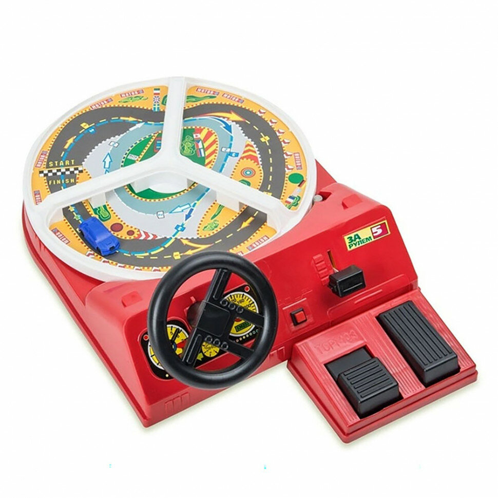 Игра с педальным приводом на котором расположен тормоз и газ, заводится кнопкой ПУСК, с механическим переключением скоростей (3 скорости). Движение автомобиля по иллюстрированному кругу с разметками направления пути. Игрушка укомплектована липкой аппликацией. Питание игры осуществляется от двух или трёх последовательно соединённых элементов типа «C» (R14). Элементы питания в комплект игрушки не входят.