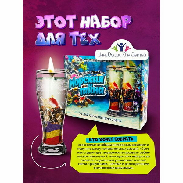 Оригинальный набор включает в себя все необходимые ингредиенты для создания невероятно красивых свечей в морском стиле. Прекрасный вариант подарка и уникальная возможность создать несколько невероятно красивых гелевых свечей.В наборе: 3 вида разноцветного декоративного песка, 2 стеклянных стакана, 2 фитиля, гель для горения, аксессуары для украшения, пластмассовый нож, ложечка и зубочистка. Гель, входящий в состав, создан исключительно из натуральных компонентов. Вы можете не переживать за безопасность своего ребенка — вся продукция бренда "Инновации для детей" выполнена из экологически чистых, качественных материалов. Увлекательный процесс создания и декорирования свечей сделает ребенка усидчивым и познакомит с новыми материалами, текстурами и ингредиентами. Коллекционные морские ракушки завершат красивый образ — ребенок увидит результативность своего труда. По итогу творческого процесса готовая свеча станет маленькой гордостью. Отлично подойдет в качестве подарка для близкого человека или украсит домашний интерьер. Главное — будет стимулировать кроху к дальнейшим экспериментам и подобного рода увлечениям.