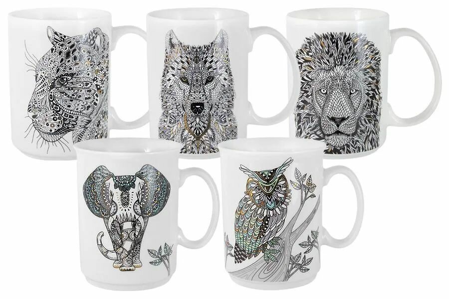 Кружки этой серии украшены тщательно прорисованными на белом фоне красивыми графическими изображениями с небольшими цветными или золотистыми акцентами.