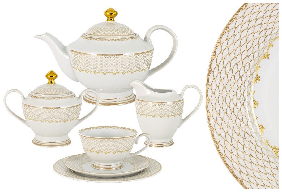 | Состав набора | блюдце - 6 шт.; десертная тарелка - 6 шт.; заварочный чайник - 1 шт.; молочник - 1 шт.; сахарница - 1 шт.; чашка - 6 шт. |