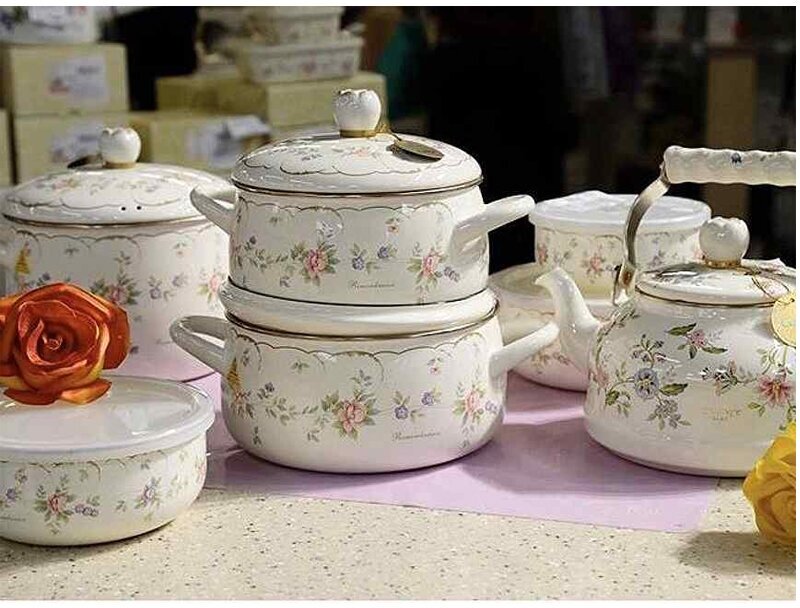 Посуда производится из углеродистой стали с последующим нанесением на штампованную стальную форму специального эмалевого покрытия и обжигается при температуре 800-850 С.