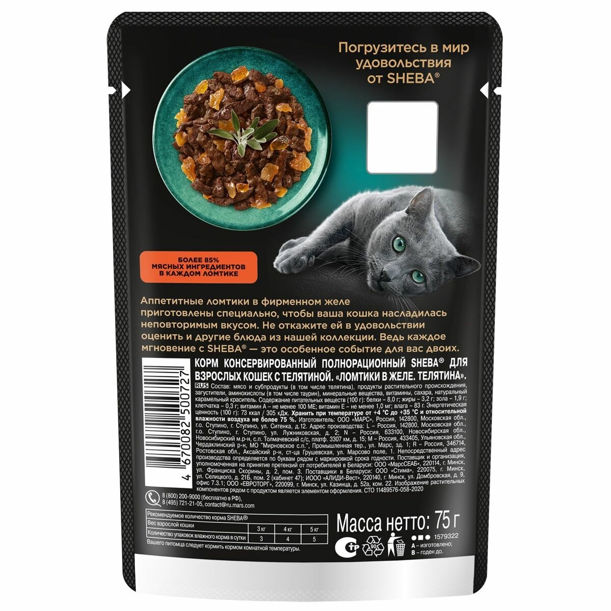 Сочные ломтики с телятиной в ароматном желе - блюдо из высококачественных ингредиентов, которое придётся по вкусу самым притязательным кошкам. Мы приготовили его по особому рецепту, чтобы раскрыть всю красоту вкуса и сохранить баланс витаминов, минералов и аминокислот, необходимых вашей любимице. Подарите своей кошке особое удовольствие, побаловав ее всеми блюдами из коллекции SHEBA®.