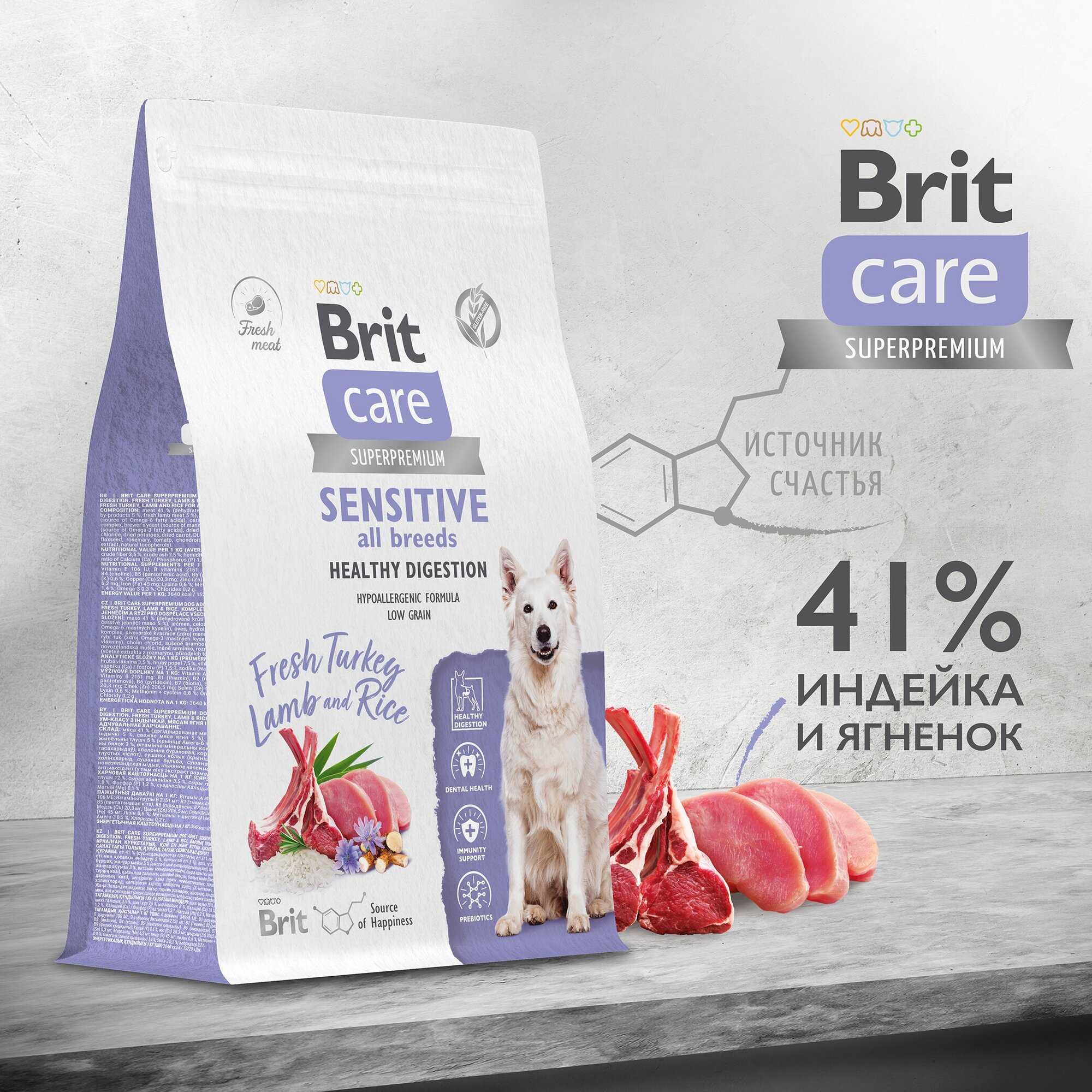 Полнорационный сухой корм суперпремиум-класса с индейкой, ягненком и рисом для взрослых собак всех пород. Чувствительное пищеварение.