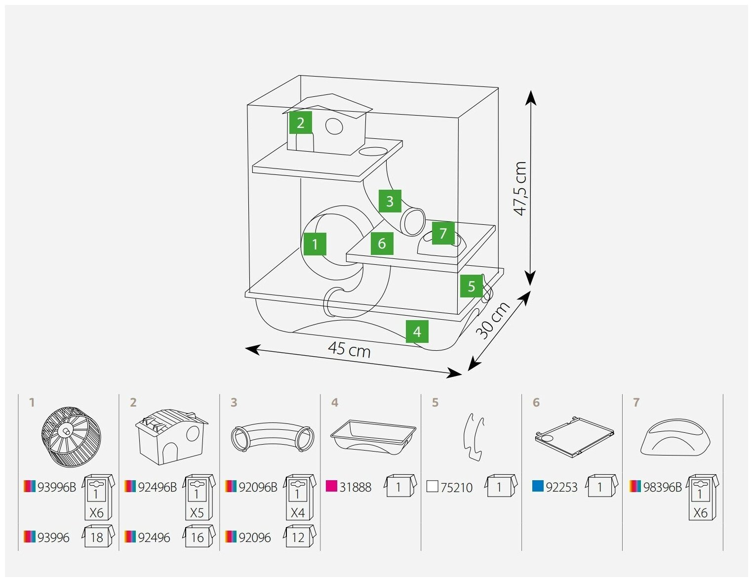 Клетка IMAC для грызунов CRICETI 7, прозрачный фуксия, 44х26х47,5см (02563)Клетка для грызунов Imac CRICETI 7 – для мелких грызунов, подойдет для одного или нескольких питомцев. Эта клетка сделана в современном дизайне ярких цветов. Для досуга маленького грызуна предусмотрены 2 платформы, 2 тоннеля, домик и колесо для бега. Также в комплект входит кормушка, устанавливаемая внутри клетки. Прутья клетки покрыты двойным гальваническим покрытием, обеспечивающим долгий срок службы, основание клетки сделано из высококачественного пластика красного цвета, приятного оттенка. Клетка оборудована 2мя дверцами, расположенными на крыше и сбоку клетки для легкого и удобного доступа к питомцам. Расстояние между прутьями 10,2 мм. Размер клетки 45х30,5х47,5смВ комплекте: Клетка2 платформы2 тоннеля1 домик1 колесо для бегаКормушкаСостав: металл, пластик