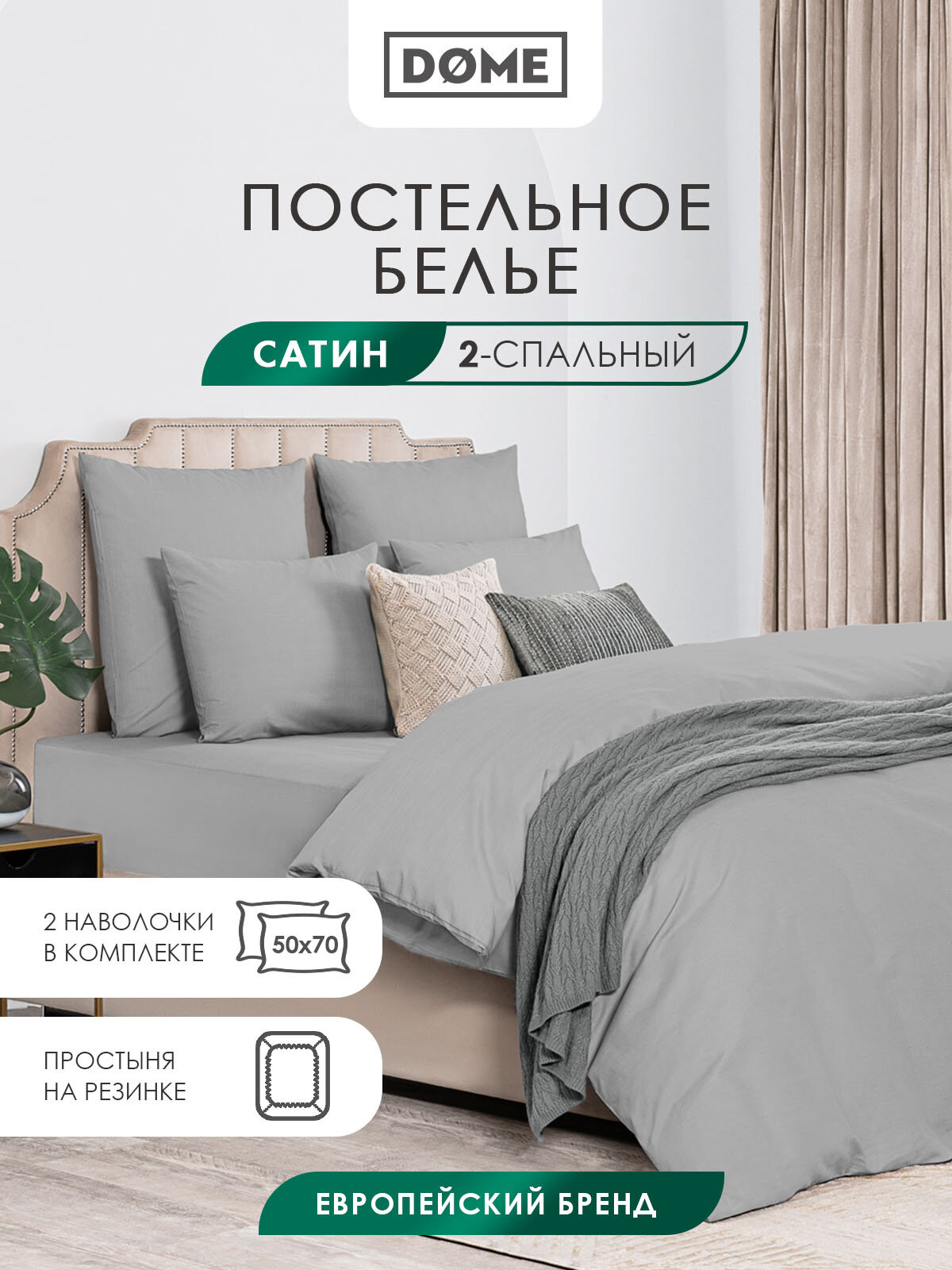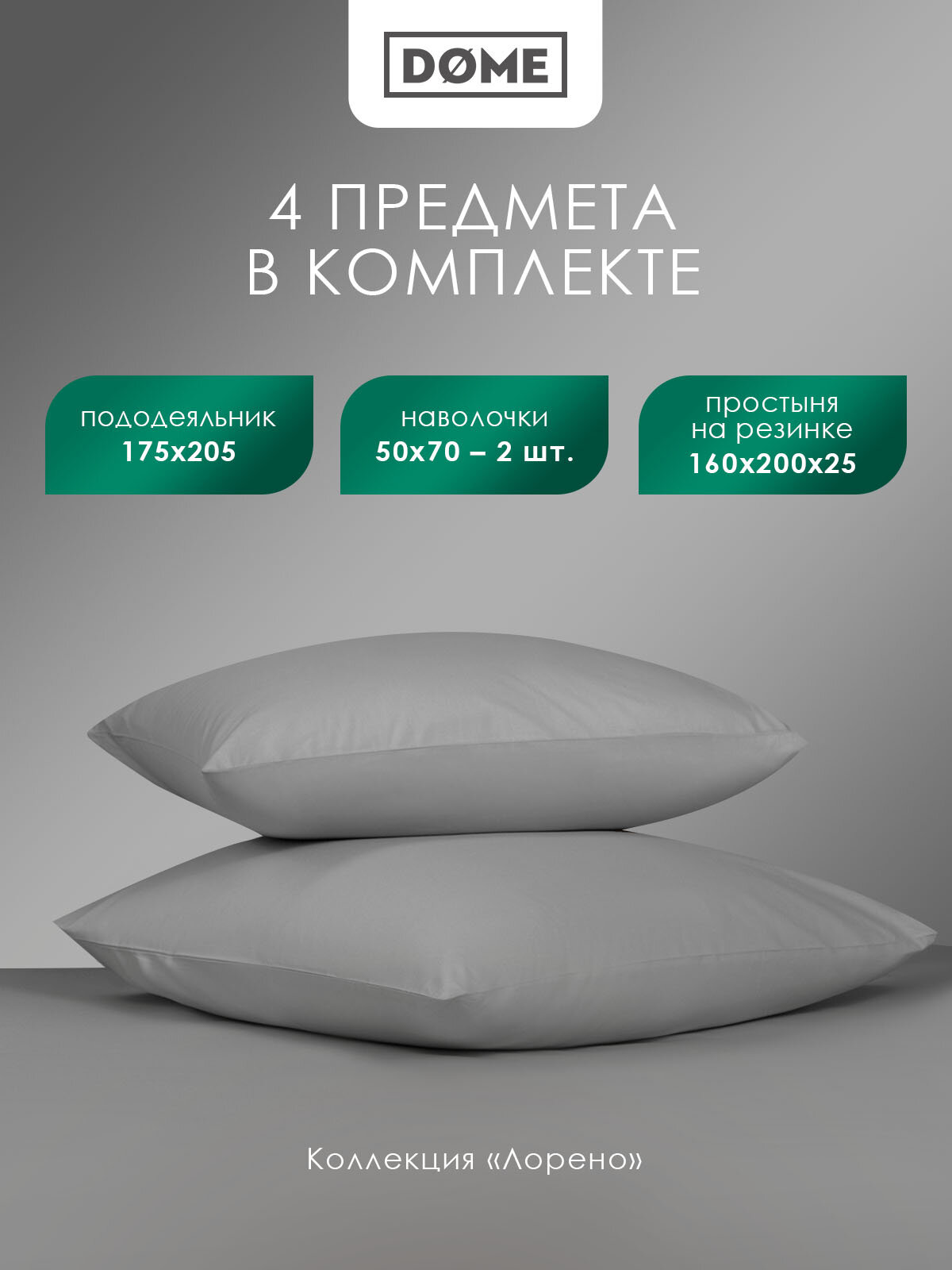 Постельное белье бренда DOME коллекции «лорено» 2-х спального размера изготовлено из 100% хлопка в плетении сатин высокого качества, плотностью 110 г/м2 в России.В комплект данного постельного белья входит простыня натяжная на резинке 160х200 с высотой борта 25 см (подходит для высоты матрасов до 20 см). Резинка, вшитая с тыльной стороны по всему периметру простыни, четко фиксирует ее на матрасе, благодаря чему имеет всегда аккуратный вид. Размер пододеяльника 175х205см. Особенность пододеяльника в этом комплекте в том, что он имеет молнию, которая предотвращает выбивание одеяла во время сна. Наволочки в комплекте (50х70 см. – 2шт.) имеют прорезь с клапаном 20 см и подходят для любых подушек размером 50х70. Бренд DOME в своём ассортименте имеет в том же цвете отдельно: комплекты наволочек 70х70 - 2 шт и 50х70 – 2 шт в коллекции «морисо», простыни классические в коллекции «фароста», простыни на резинке и пододеяльники на молнии в коллекции «лорено», что даст возможность дополнить комплект постельного белья отдельными предметами для вашей спальни дома или в загородном доме.