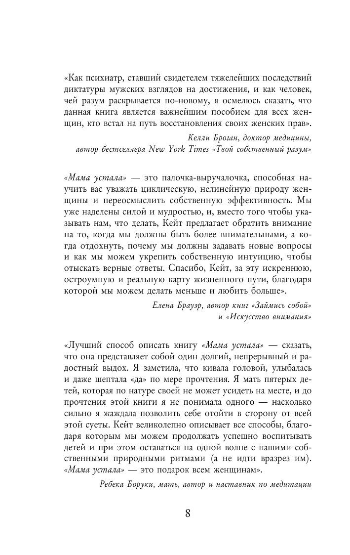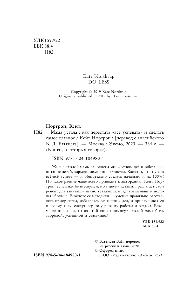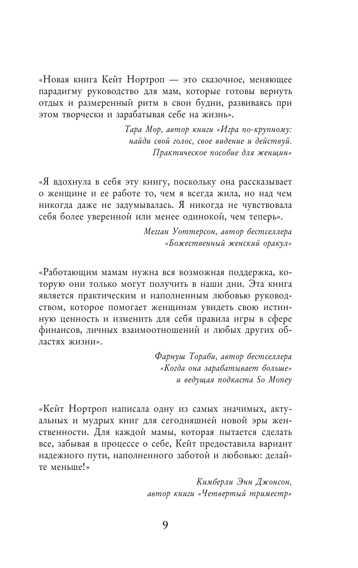 Каждая мама стремится успеть везде и всюду: воспитывает детей, делает карьеру, создает уют дома. Жизнь превращается в гонку на выживание, где нет места удовольствию и гармонии. Кейт Нортроп, мама и успешная бизнесвумен, предлагает остановиться и прислушаться к себе, вспомнить о своей истинной природе и научиться жить по естественным ритмам, не требуя 100% совершенства и исполнения всех планов. Если вы хотите быть счастливой, здоровой и успешной, все, что нужно — просто вычеркнуть лишнее из списка дел и уделять время тому, что действительно важно. В этой книге вы найдете множество практических советов, которые помогут делать меньше и успевать гораздо больше!
