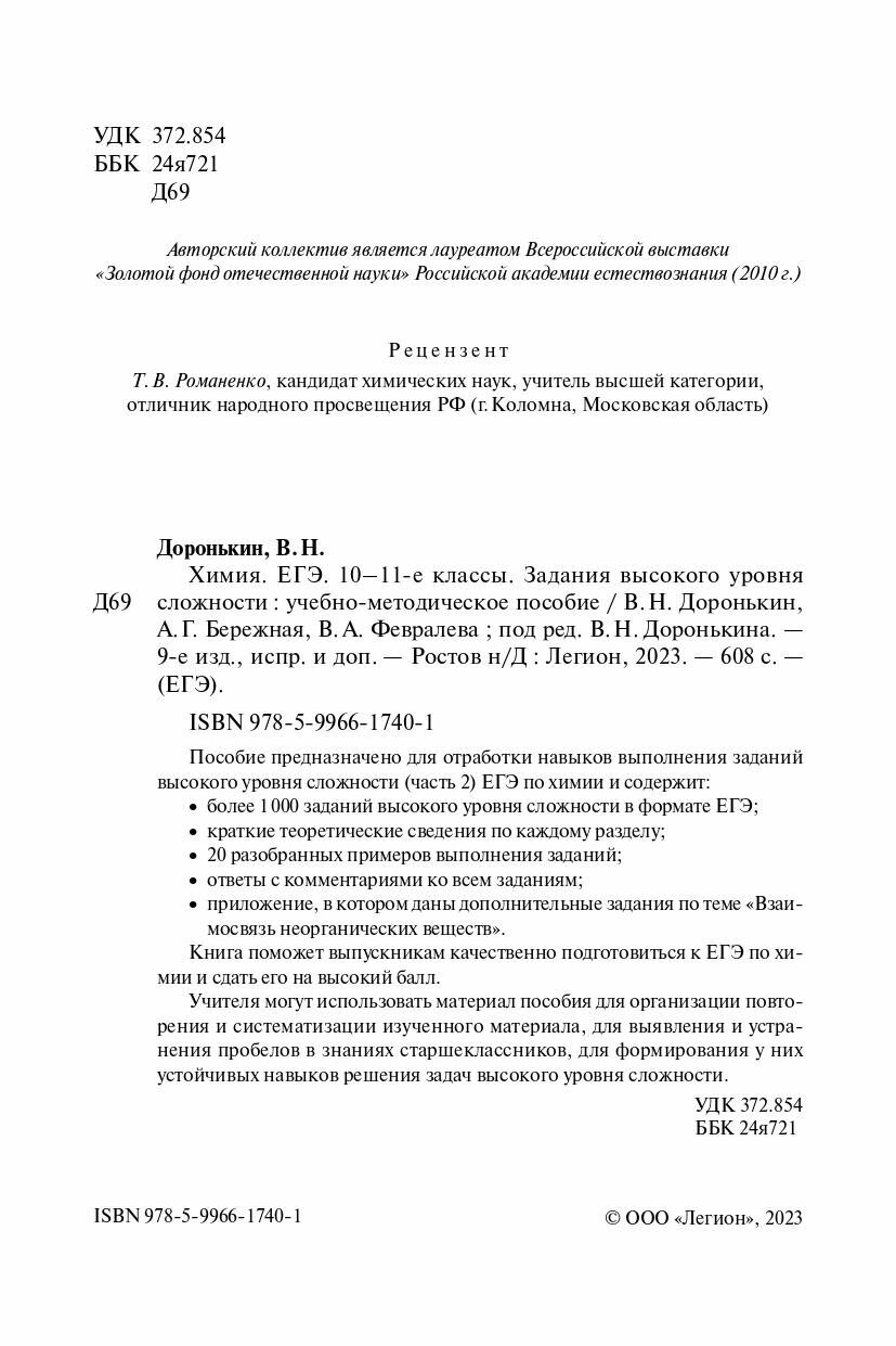 Химия. ЕГЭ. 10–11 классы. Задания высокого уровня сложности (Февралева Валентина Александровна,Доронькин Владимир Николаевич,Бережная Александра Григорьевна); Легион, 2023