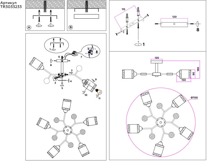 | Номенклатура | TR3033233/5 GR/LW/SM серый/светлое дерево/дымчатый E27*5 max 60W D700*180 |