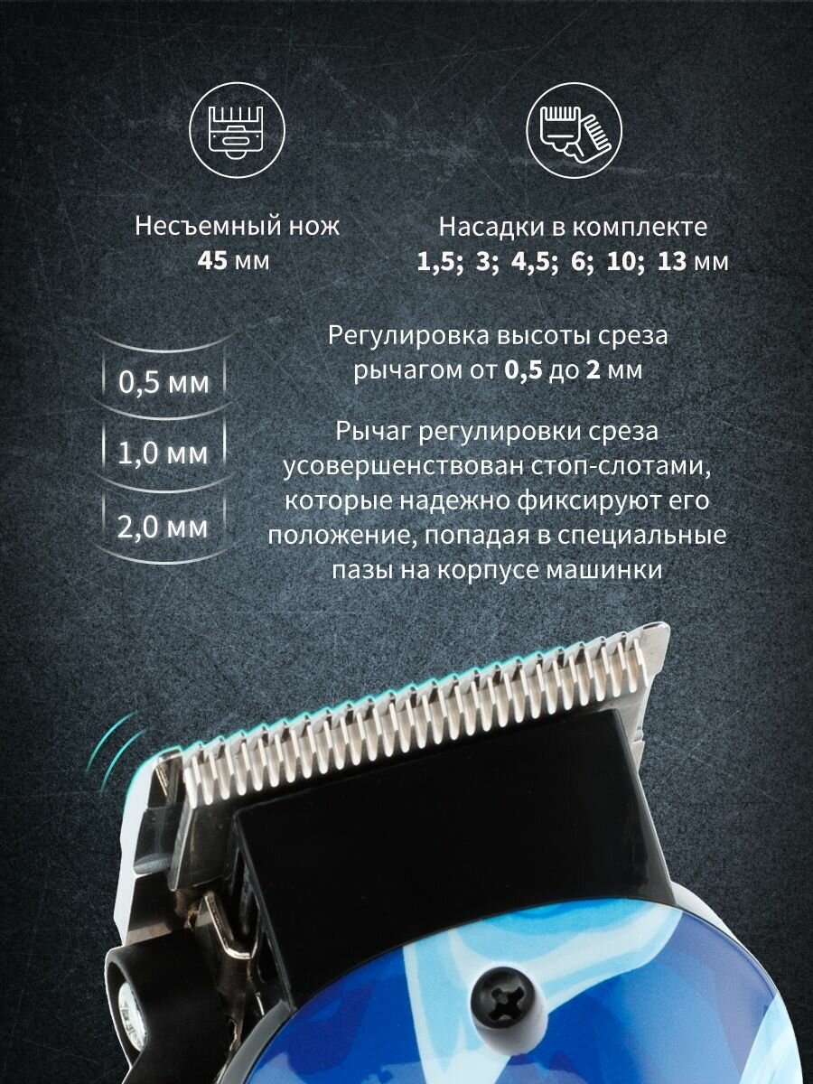 Машинка DEWAL SPLASH оснащена ножом из стали шириной 45 мм с регулировкой высоты среза от 0,5 до 2 мм. Для фиксации рычага регулировки предусмотрены стоп-слоты, которые надежно закрепляют выбранное положение ножа и позволяют избежать непроизвольного изменения высоты среза. Так же машинка укомплектована 6 насадками различной длины (1,5; 3; 4,5; 6; 10; 13 мм).
