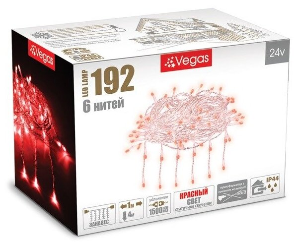 Размер гирлянды 1х4 м, количество светодиодов 192. Количество нитей 6. Цвет свечения желтый, режим свечения статичный, цвет провода прозрачный. Степень защиты IP 44. Мощность 3,84 W. Температурный диапазон использования от -30 до +50 °С. Есть возможность последовательного соединения до 1 500 LED. Трансформатор в комплект не входит! Приобретается отдельно. Срок службы 25 000 часов.Для создания декоративной и праздничной иллюминации. Электрогирлянды формы "Занавес" предназначены как для внешнего, так и для внутреннего декорирования (рекламного освещения витрин, украшения окон, декорирования объемных объектов, арок и других архитектурных элементов).Способ применения: 1. Достаньте изделие из коробки, осмотрите ее на отсутствие повреждений. 2. Проверьте работоспособность изделия, подключив его к источнику питания. 3. Перед осуществлением монтажа необходимо чтобы изделие приобрело комнатную температуру. 4. Разместите изделие на объекте и для начала использования подключите ее к источнику питания. 5. Для окончания работы отключите изделие от источника питания. 6. В случае обнаружения неисправностей, выключите изделие и обратитесь в специализированный сервисный центр. Внимание: использование изделия с поврежденным корпусом или изоляцией категорически запрещается! Также запрещается внесение изменений в конструкцию изделия!Условия хранения: Хранить рекомендуется в штатной упаковке в сухом помещении с естественной вентиляцией.Рекомендации по уходу: 1. Избегайте ударных нагрузок и механических повреждений. 2. Не используйте с поврежденной изоляции. 3. Лампы не подлежат замене. 4. Не погружайте изделие в воду и не давайте детям.