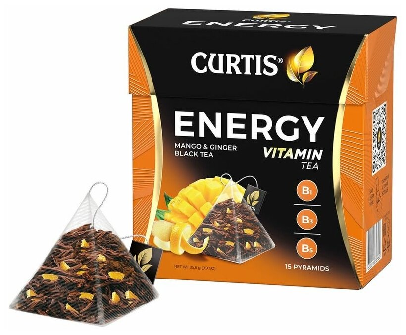 Чай цейлонский чёрный листовой ароматизированный энерджи, обогащённый витаминами В1, В3, В5 с кусочками манго и имбиря, цедры цитрусовых и лепестками цветов в пирамидках. Витамины группы В помогают противостоять усталости и способствуют сохранению энергии при активной интеллектуальной деятельности.