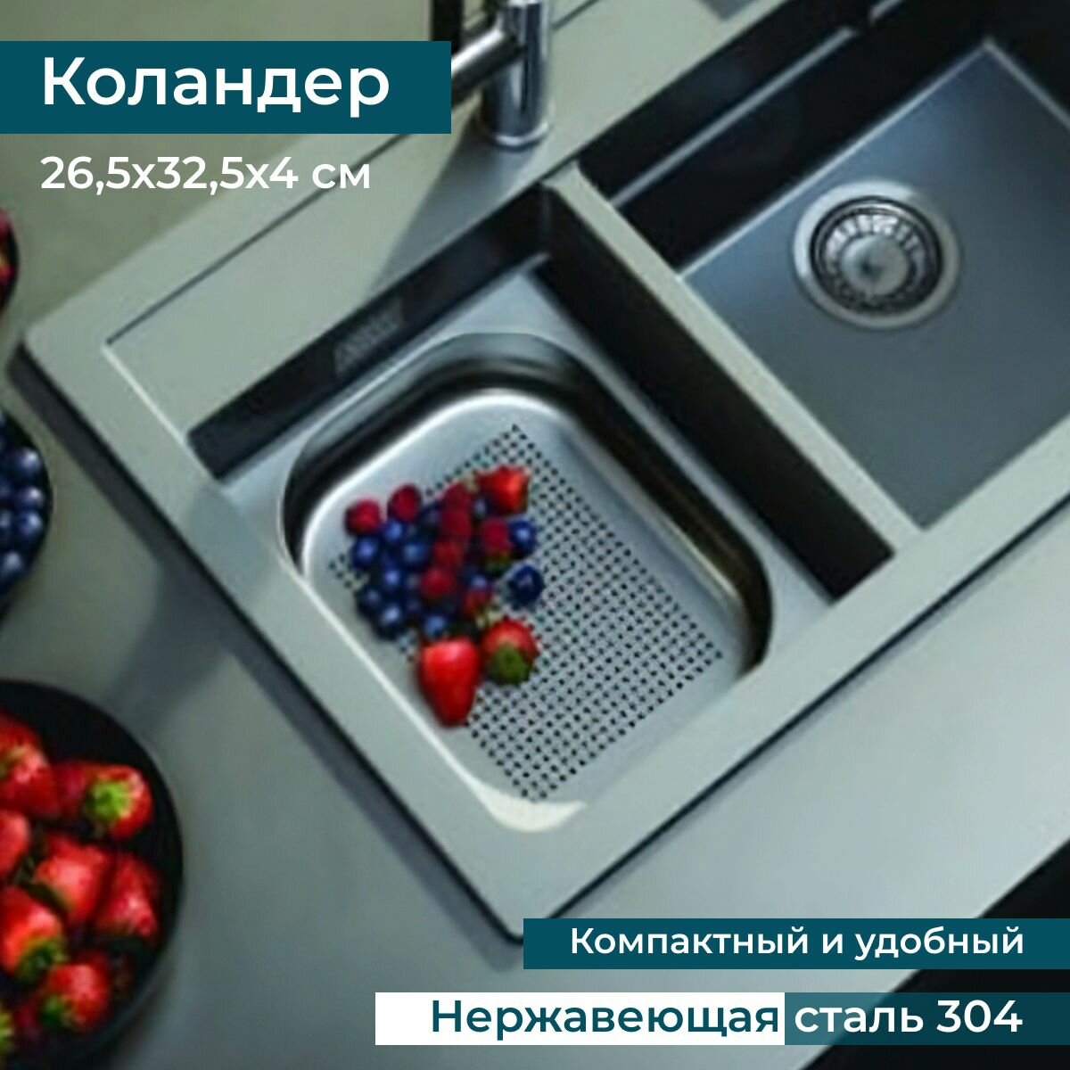 Коландер для кухонной мойки представляет собой небольшую емкость, на дне которой располагается множество мелких отверстий. Внешне он немного напоминает дуршлаг (сито), только не имеет ручки. Впрочем, она ему не нужна, так как аксессуар для кухни крепится на стенки чаши. Этот момент важно учитывать при выборе модели. Удобно мыть и сушить фрукты, овощи, зелень, посуду, размораживать мясо, рыбу, сливать воду и даже промыть рис, макароны. GN-1/2-P (для коллекции моек Atrox) Материал: Нержавеющая сталь 304 Размер мойки: 265X325