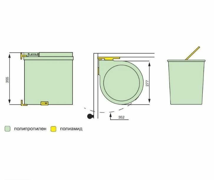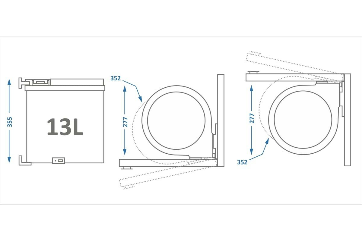 Основные характеристики:ведро предназначено для установки в базу шириной минимум 400 ммобъем: 13 лвыдвижение автоматическое при открывании фасадакрышка поднимается при открывании фасада и остается внутри каркасанагрузка на крепления: 4 кгдля ухода используйте только воду и нейтральные моющие средства (нельзя использовать абразивные вещества и материалы)Варианты крепления:крепление к фасаду и каркасу универсальное (левое/правое)корпус крепится к фасадукрышка крепится к каркасуведро снимаетсяВ комплект входит:съемное ведро объемом 13 л (1 шт.)корпус ведра (1 шт.)крепление к каркасу (1 шт.)крепление к фасаду (1 шт.)шуруп 3,5х16 (6 шт.)