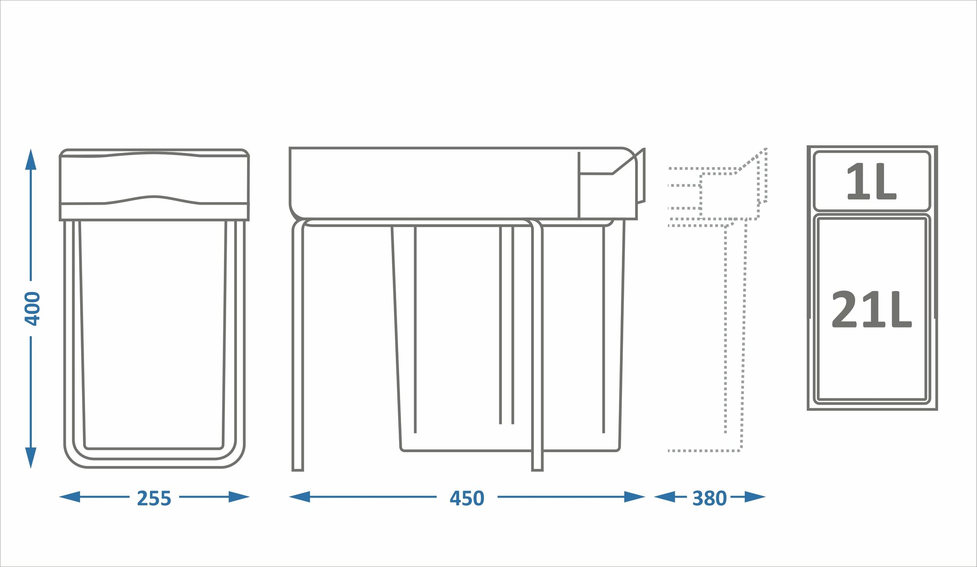 Система состоит из двух контейнеров - основного, объемом 21 литр, и дополнительного, объемом 1 литр. Ведра изготавливаются из экологически чистых полимерных материалов, которые легко и просто чистятся. Встроенные ручки обеспечивают простое обращение и надежное прикрепление пакетов для отходов. Система крепится на дно кухонного шкафа легко и быстро и плавно выдвигается по металлическим направляющим. Предупреждает распространение неприятных запахов. Предназначена для установки в шкаф 30 см. Размеры 255x455x400 мм.