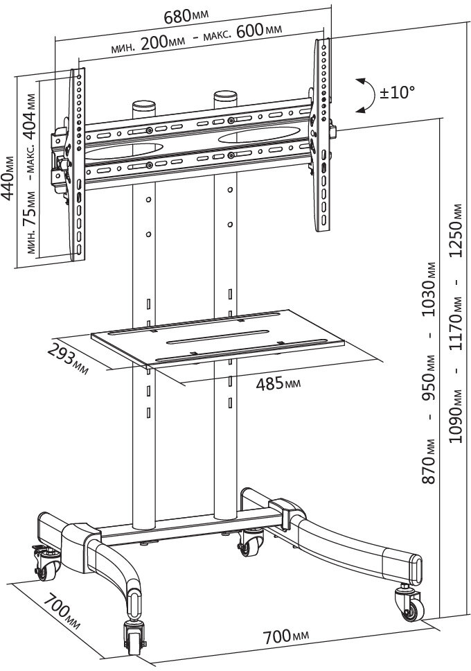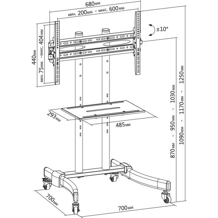 Стойка для телевизора Cactus CS-ST1030BK черный, рекомендуемая диагональ 37"-70", максимальная нагрузка 50кг, напольный, мобильный, угол наклона -10/+10