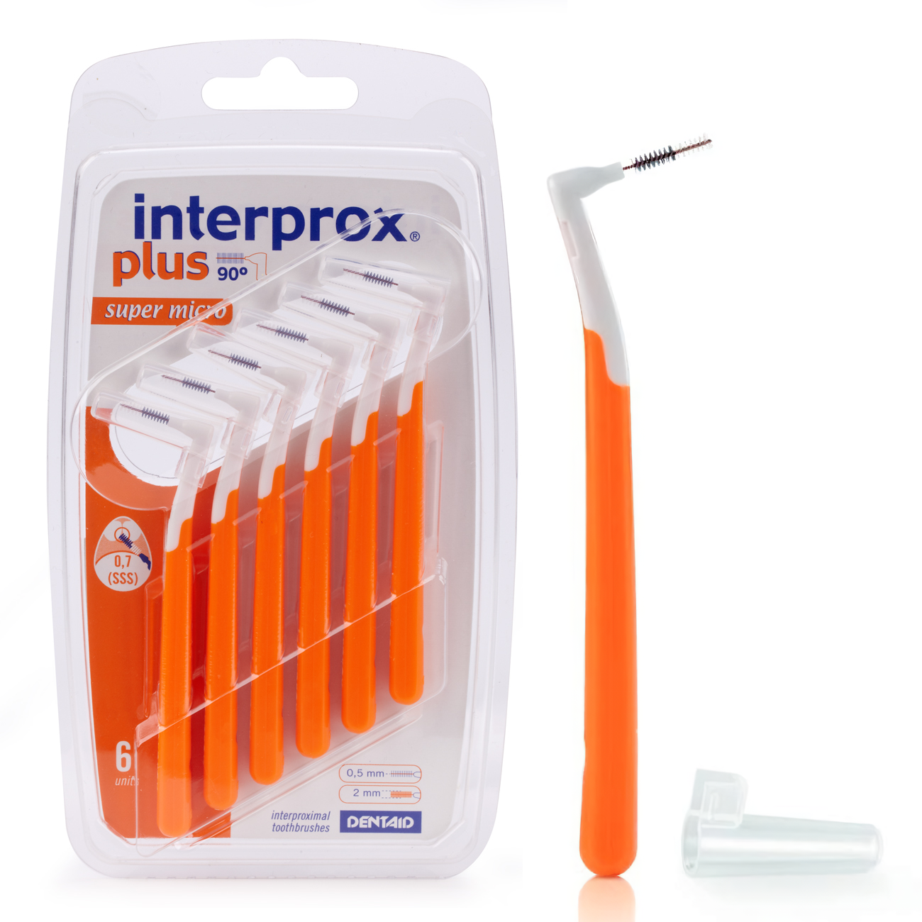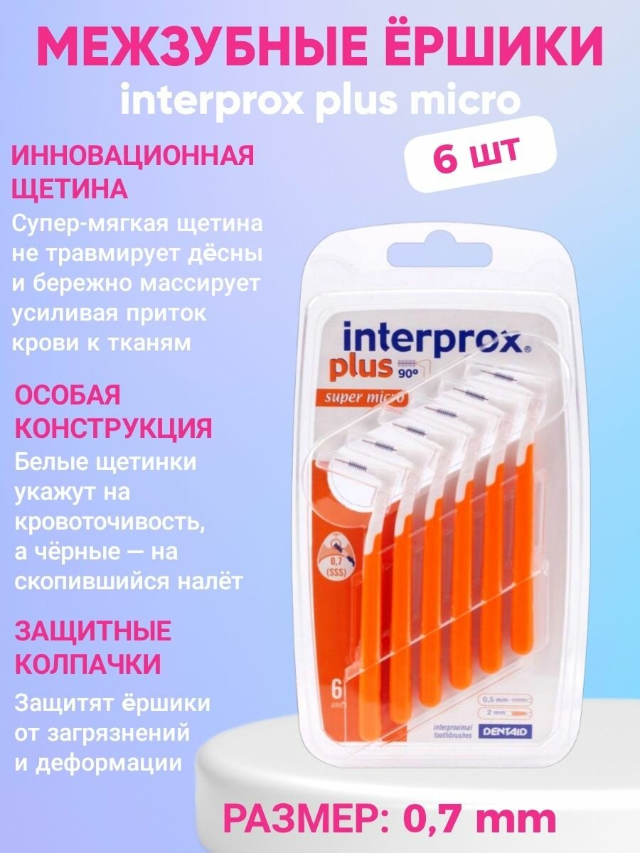 Набор Interprox Plus Super Micro состоит из 6 ершиков с диаметром стержня 0,5 мм и диаметром щетинок 2 мм. У каждого ершика есть защитный колпачок. Рекомендованы для межзубных промежутков размером 0,7-0,8 мм. Ручка и головка ершиков расположены под углом 90°, что облегчает процесс чистки. Щетинки, изготовленные из нейлона Tynex®, двухцветные: черные щетинки показывают удаленный зубной налет, белые - кровоточивость десен. Гибкая каркасная проволока покрыта полиуретаном, поэтому не царапает эмаль и десна.Межзубные ершики помогают удалить налет, уменьшить кровоточивость десен и предотвратить неприятный запах изо рта. Подходят для очистки имплантатов и брекет-систем.
