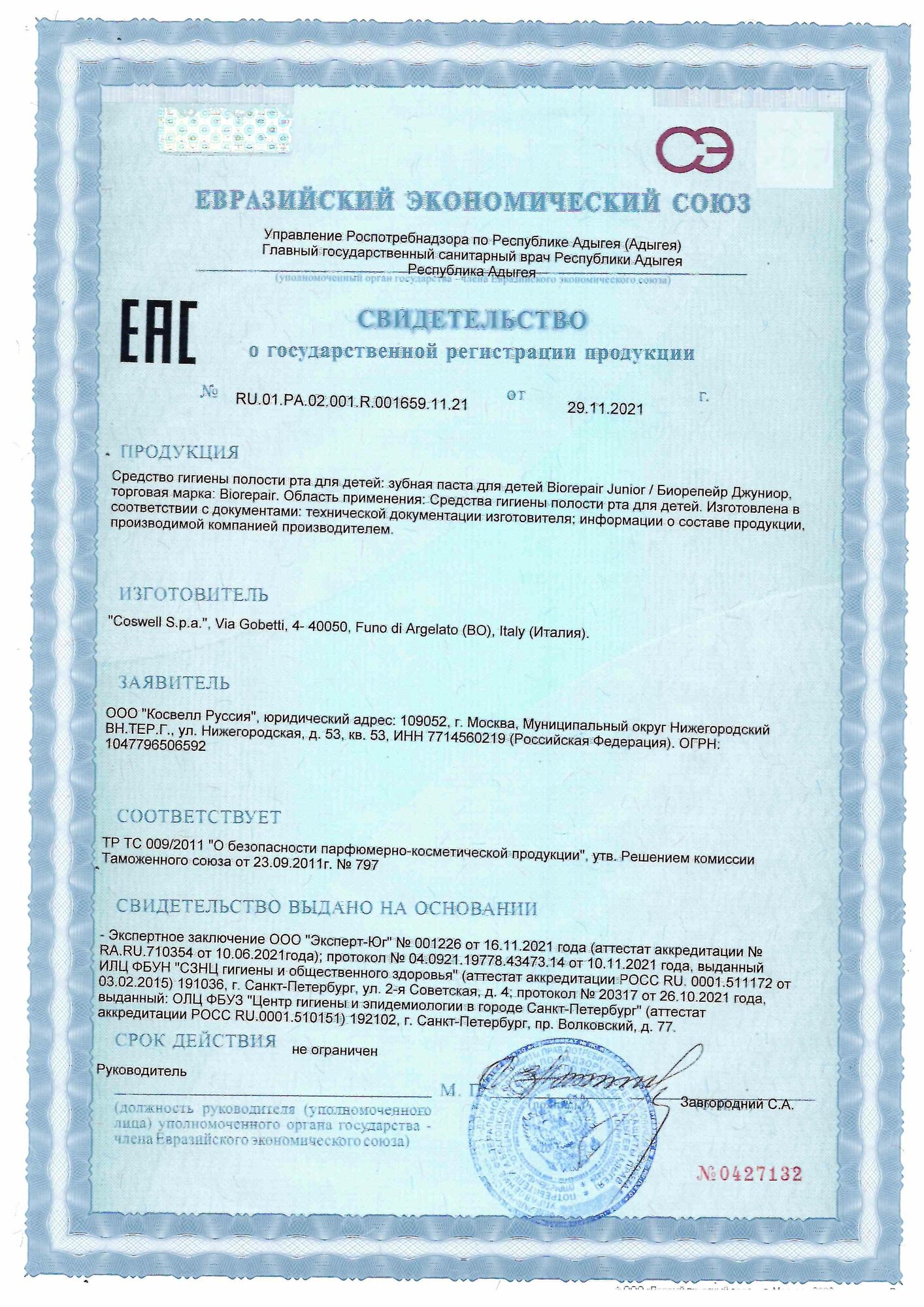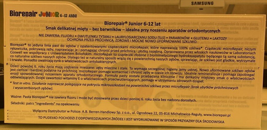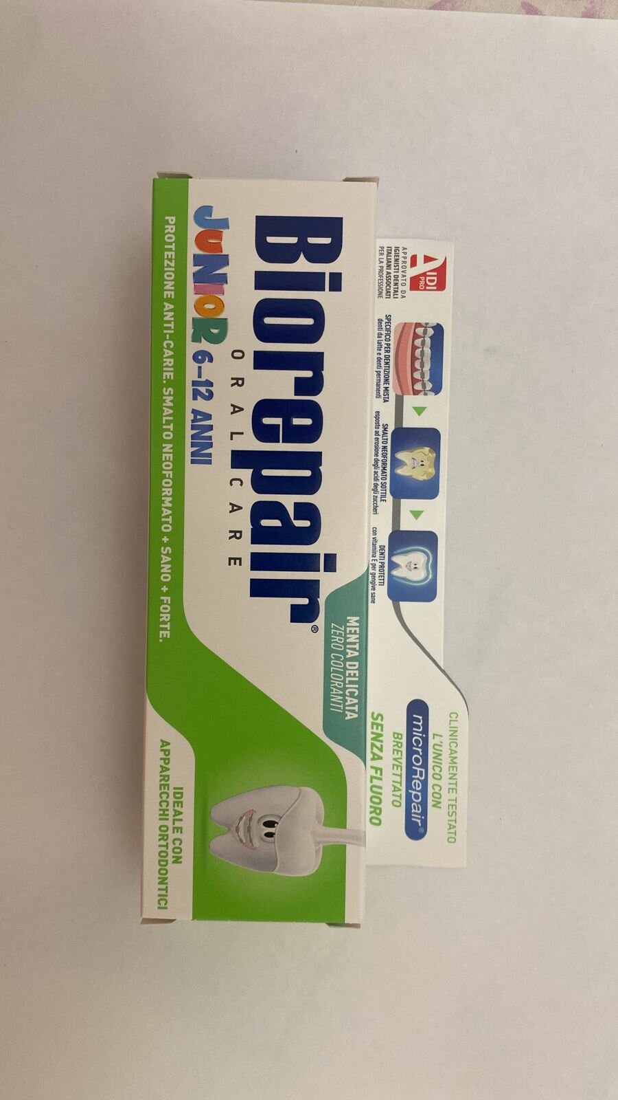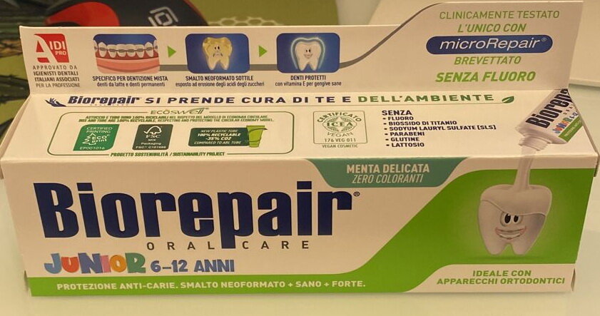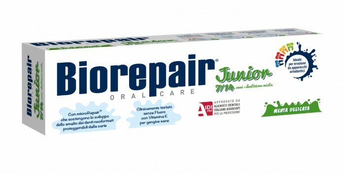 Biorepair Junior - уникальная инновационная зубная паста, восстанавливающая и укрепляющая эмаль. Она содержит в составе активное вещество MicroRepair. Это химическая смесь микрокристаллов гидроксиапатита (цинк-замещенный-карбонат-гидроксиапатит), сходных по составу с зубной эмалью и способных соединяться с эмалью и дентином, восстанавливая тем самым естественную защиту зубов.