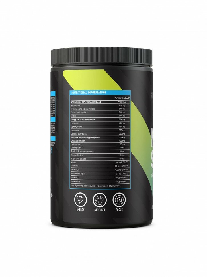 | Состав | Бета-аланин, аргинин альфа-кетоглутарат, цитруллин-DL-малат, антислеживатели (изомальтоза, диоксид кремния, магниевые соли жирных кислот, трикальцийфосфат), подкислитель (яблочная кислота), L-тирозин, L-фенилаланин, таурин, L-карнитин тартрат, кофеин, битартрат холина, ароматизаторы, L-глютамин, подсластители (сукралоза, ацесульфам-К), красители (антоциан), экстракт женьшеня (женьшень обыкновенный), экстракт корня родиолы (родиола розовая), листья оливы экстракт (Olea Europea L.), экстракт виноградных косточек (Vitis vinifera), никотинамид, тиамина гидрохлорид, холекальциферол, D-пантотенат кальция, пиридоксина гидрохлорид, цианокобаламин |