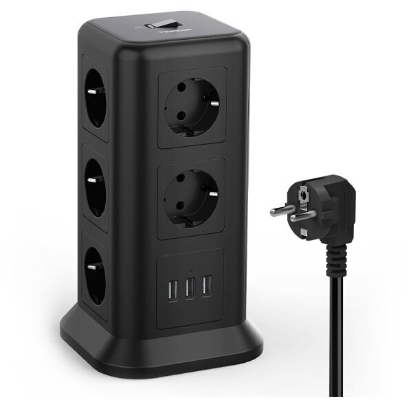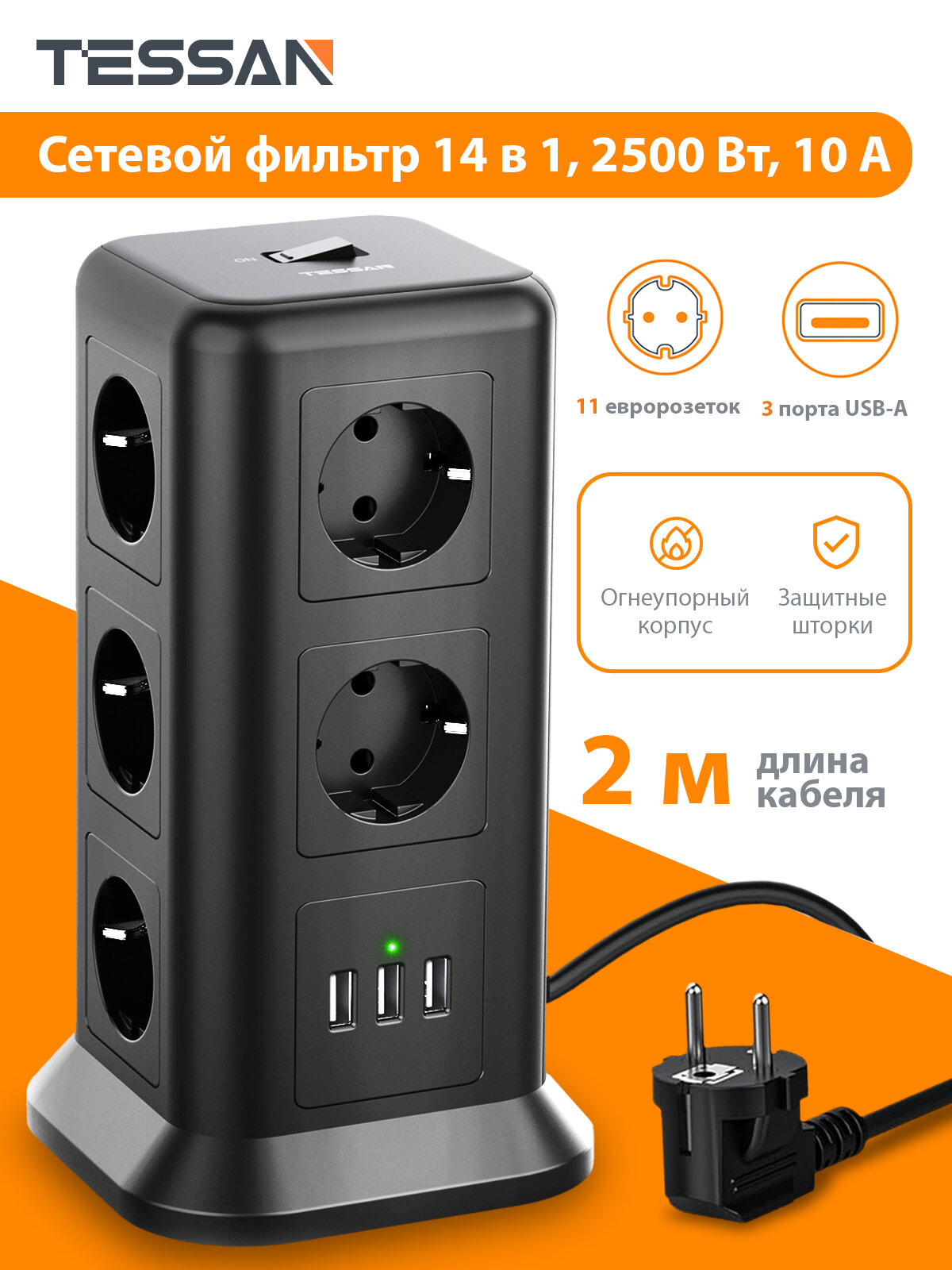 Сетевой фильтр TESSAN 11 евророзеток 220В и 3 USB и кн. питания 2500Вт до 10А кабе TPS01-DE Black