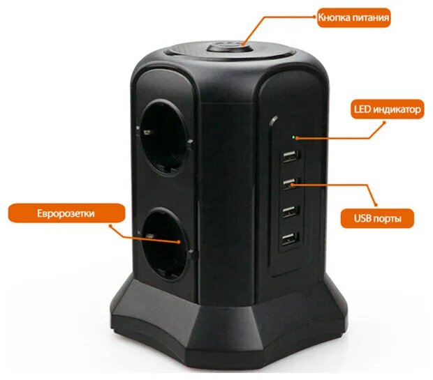 Сетевой фильтр с 6 розетками 220В, 4 USB портами и кнопкой питания. Компактный дизайн. LED индикатор. Защита от перегрузки и скачков напряжения. Огнеупорный материал корпуса. Высококачественный медный кабель 2 метра.