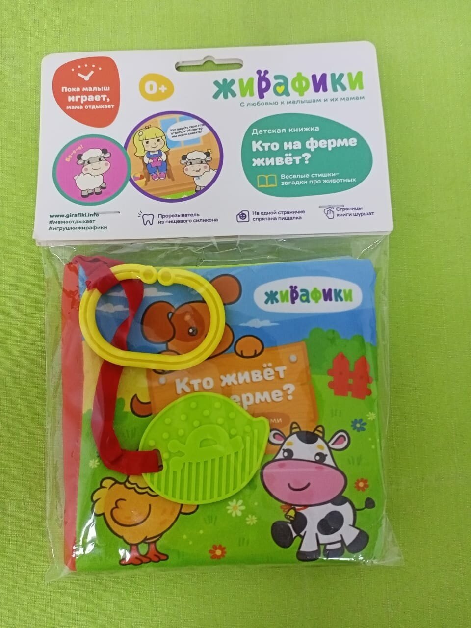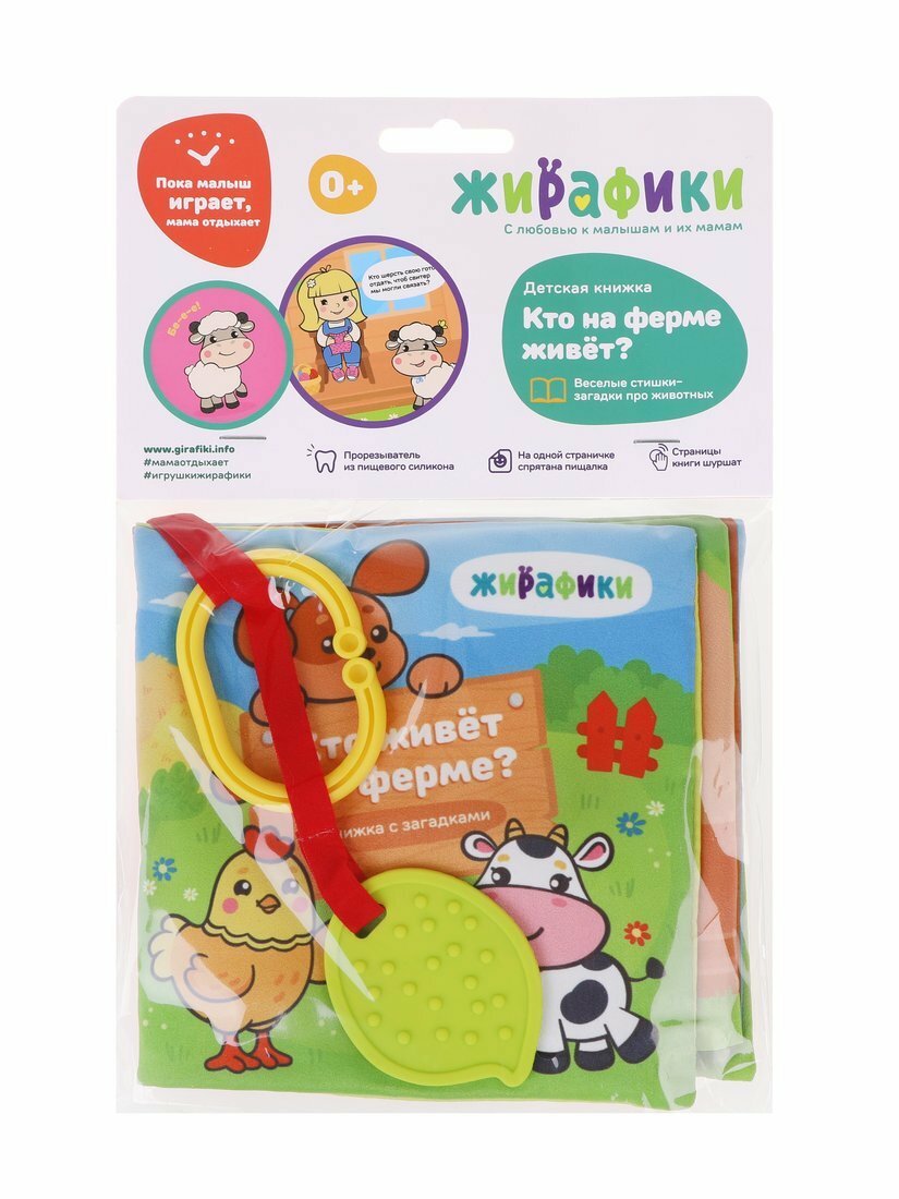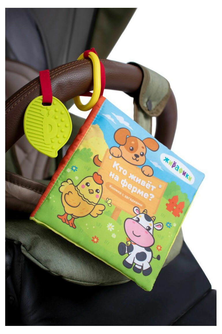 Мягкая книжка-картинка Кто на ферме живет? познакомит малыша с милыми обитателями фермы! В ней собраны веселые стишки и интересные загадки о коровке, курочке, щенке и барашке. Странички книжки шуршат: их так и хочется перелистывать пальчиками! На одной из страничек спрятан сюрприз забавная пищалка, которая приведет малыша в полный восторг. А мягкий прорезыватель из пищевого силикона поможет крохе в период активного роста зубок.
