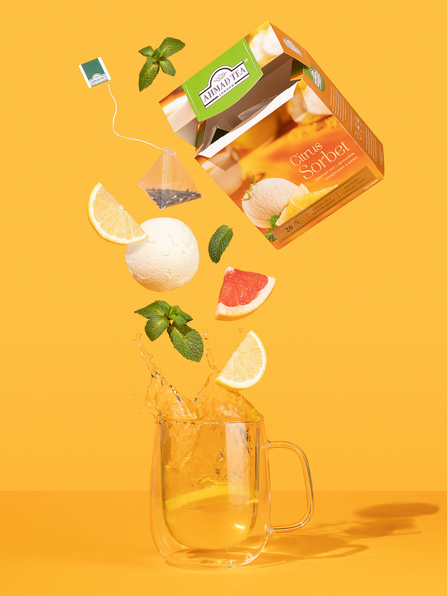 Цитрусовый сорбет от Ahmad Tea - букет утонченного зеленого чая, который раскрывается в обрамлении сочного грэйпфрута и лимонно-мятных нот. Вдохновленный популярным итальянским десертом, вкус чая наполнит каждую чашку цитрусовым ароматом и свежестью.