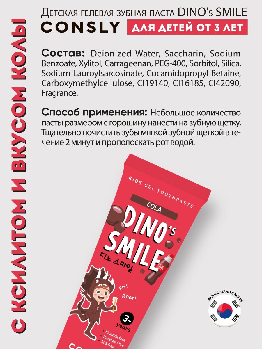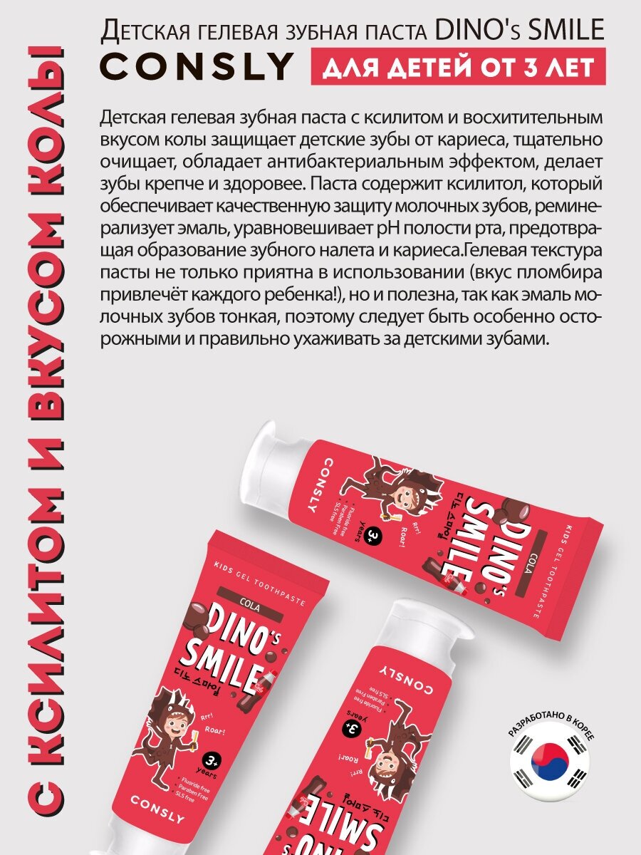 Детская гелевая зубная паста с ксилитом и восхитительным вкусом колы защищает детские зубы от кариеса, тщательно очищает, обладает антибактериальным эффектом, делает зубы крепче и здоровее.