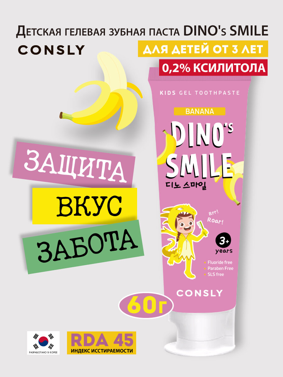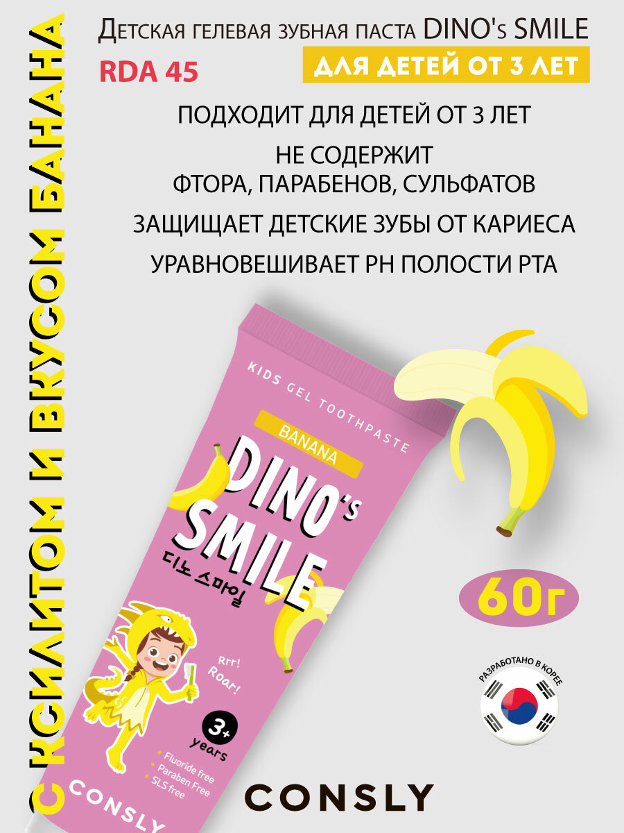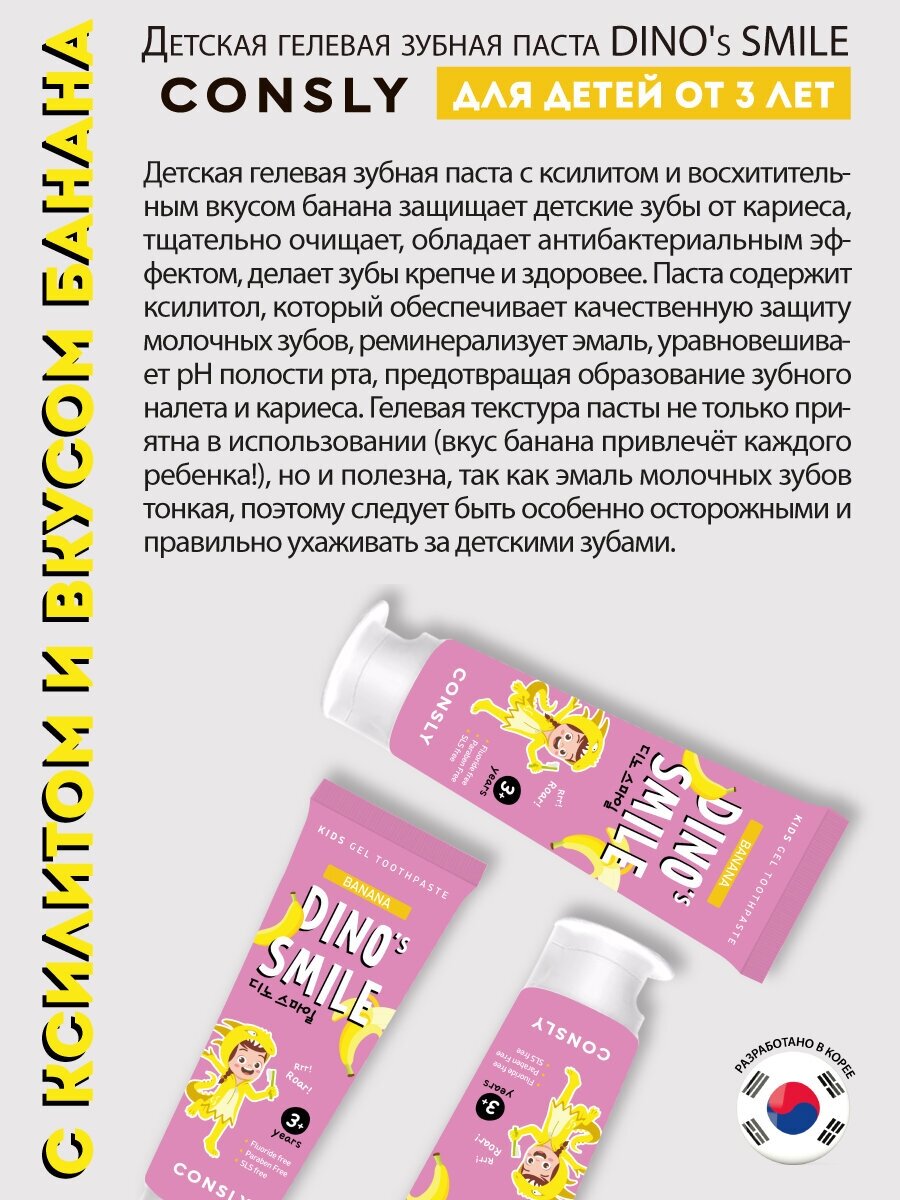 Детская гелевая зубная паста с ксилитом и восхитительным вкусом банана защищает детские зубы от кариеса, тщательно очищает, обладает антибактериальным эффектом, делает зубы крепче и здоровее.