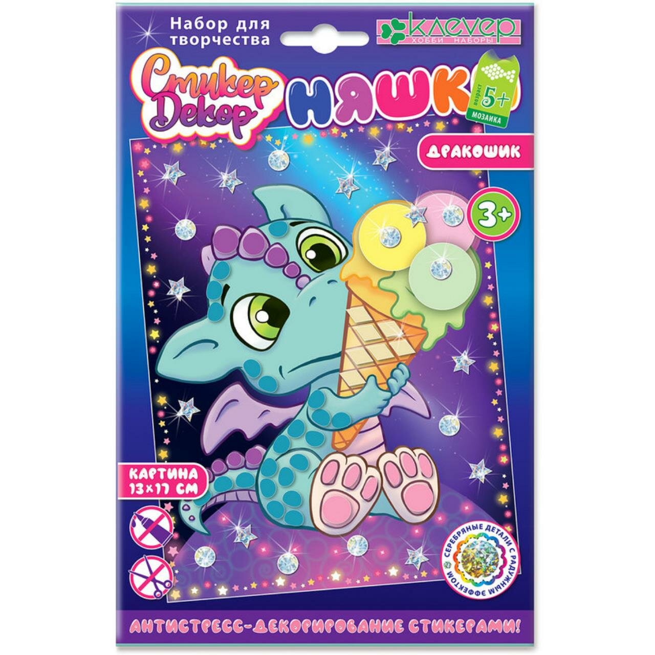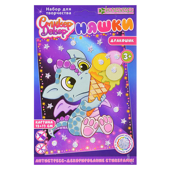 Детям от 3-х лет будет несложно создать картину с лакомкой-Дракошиком: нужно наклеить стикеры-бугорки гребня, стикеры-чешуйки и стикеры-подушечки на ножках, стикеры-ромбики и шарики мороженого - на изображение персонажа на фоне, затем наклеить голографические круги и звёзды на изображение планеты, на которой сидит Дракошик, заполнить пространство вокруг Дракошика и планеты голографическими стикерами, - и замечательная картина с ярким персонажем на фоне звёздного неба готова!