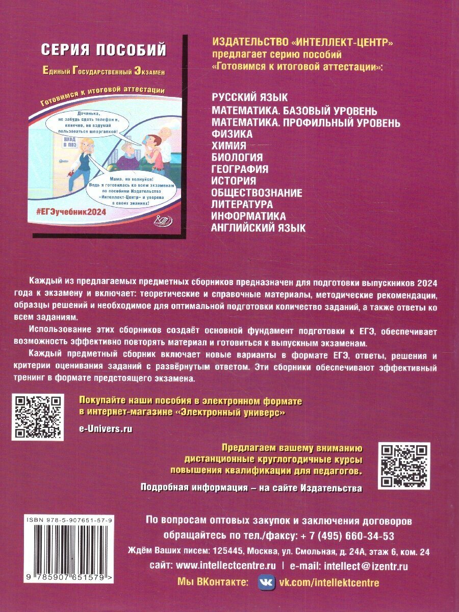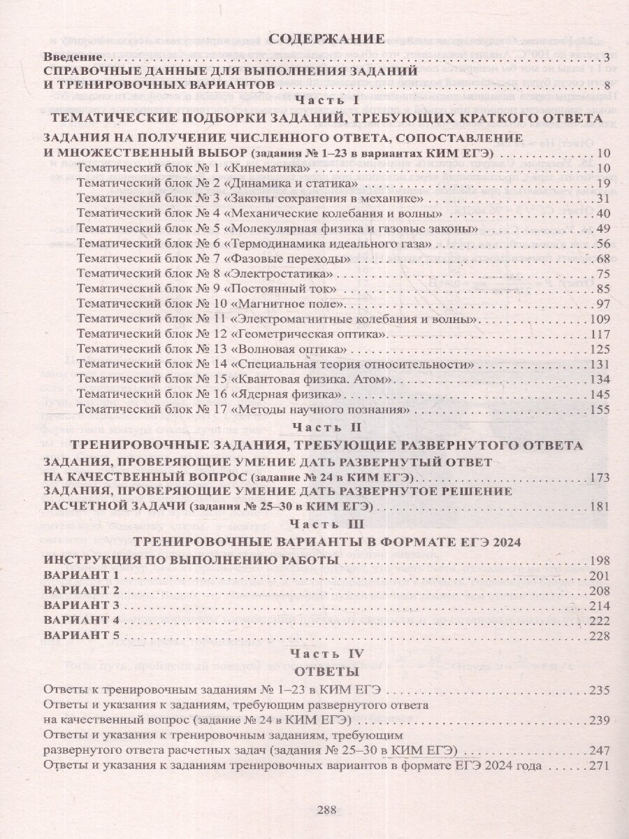 Данное пособие предназначено для подготовки учащихся 10-11 классов к Единому государственному экзамену (ЕГЭ) по физике. Издание включает типовые задания по всем содержательным линиям экзаменационной работы, а также примерные варианты в формате ЕГЭ 2024 года. Пособие поможет школьникам проверить свои знания и умения по предмету, а учителям - оценить степень достижения требований образовательных стандартов отдельными учащимися и обеспечить их целенаправленную подготовку к экзамену. Пособие может быть также использовано учителями как сборник заданий в формате ЕГЭ при системном изучении курса физики в 10-11 классах.